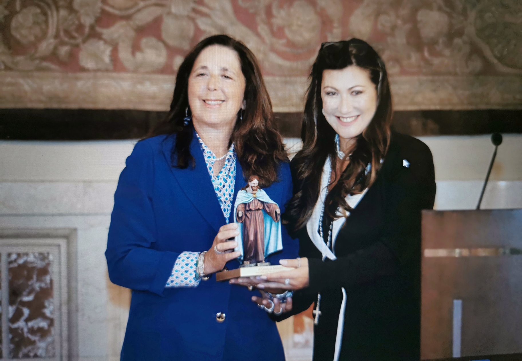 Nel corso dell’evento le è stato donato una copia del volume e l’anello Amen dei Valori e la Madonnina Miracolosa; ed una riproduzione in scala del Salvator Mundi. Che rappresenta, dunque, un'icona di speranza, un richiamo a credere nel potenziale dell'umanità per creare un mondo eticamente sostenibile. La statua originale, opera lignea, altra oltre 2 metri, incarna l'essenza del messaggio di pace e di rinascita che permea il libro stesso: Ama, Dona e Perdona.