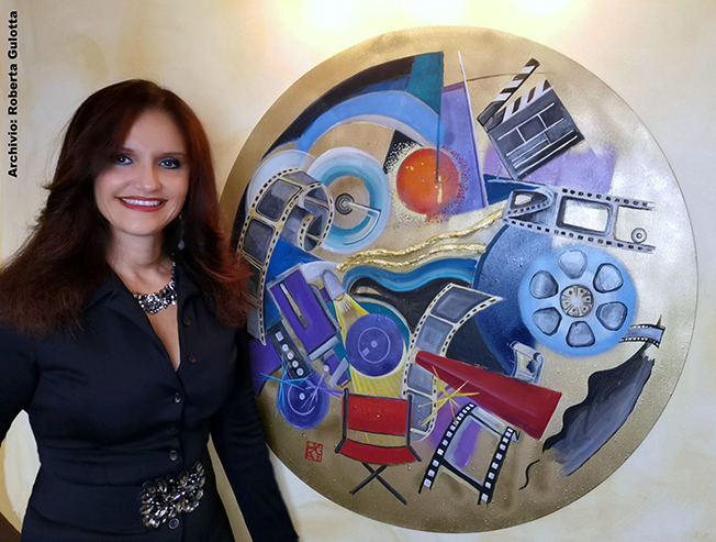 Le opere di Roberta Gulotta esposte in questa Mostra saranno due: “Sogni di celluloide” tela rotonda del diametro di cm. 100 (Tempera acrilica su tela a vernice dorata con inserti) e “Chronos” (tela rotonda del diametro di cm. 100, tempera acrilica su tela a vernice dorata).