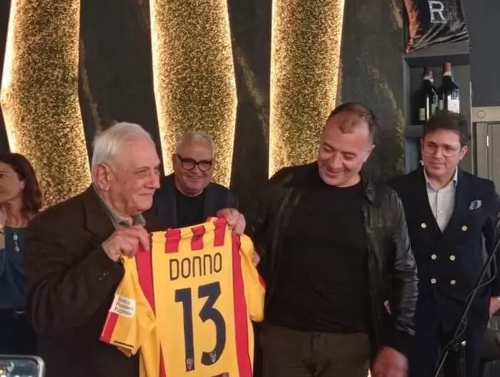 Una vita per il giornalismo e per il suo Lecce. Il decano del giornalismo leccese Elio Donno, ormai 85 anni, nel corso di un incontro organizzato per festeggiare la promozione in Serie A della squadra locale, ha ricevuto dalla società calcistica una speciale maglia celebrativa.