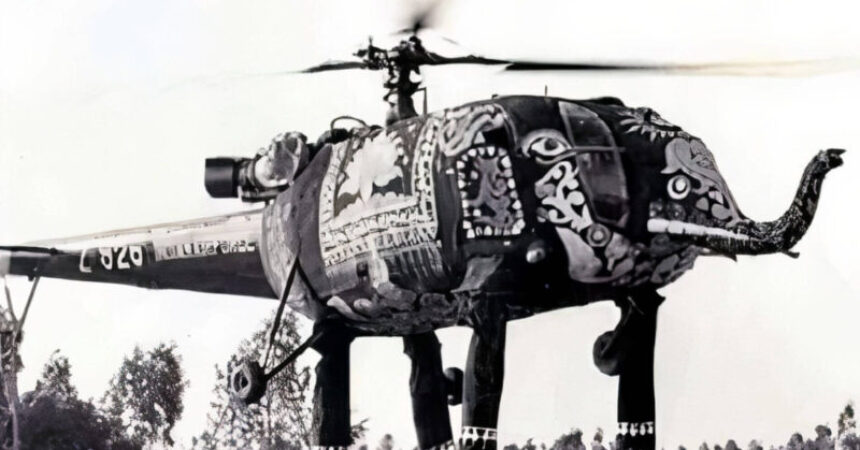 (Foto: Un elicottero Cetak rivestito da elefante durante la sua prima parata militare nel 1970)