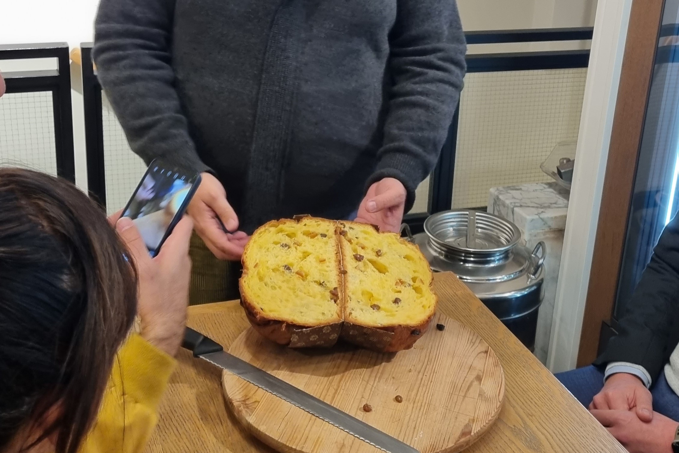 “Dillo con…” invita il cartoncino colorato che accompagna il dolce. “ Il panettone di Giuffrè è tutto questo: “Il panettone è quel momento che, insieme uno accanto all’altro, ne strappi via un pezzo… Il panettone è ‘dammi il pezzo con la glassa’ …” ha descritto efficacemente lo chef aprendo il grande dolce morbido che, una volta tagliato, ha sprigionato quei sentori e profumi che fanno subito casa.