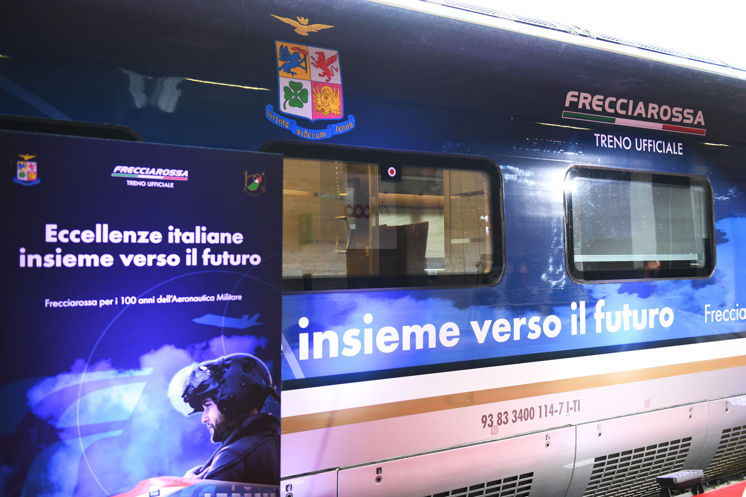Si è tenuta ieri, al Binario 1 della Stazione Termini di Roma, la presentazione del Frecciarossa dedicato all'Aeronautica Militare, in occasione dei 100 anni della sua fondazione.