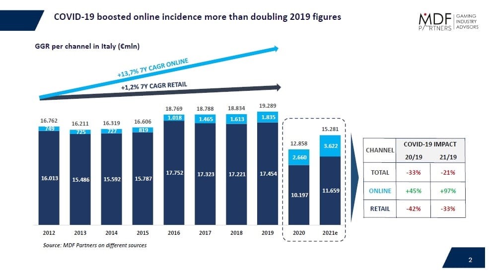 Nel complesso si nota come la crescita del gioco online a livello di entrate lorde da gioco non sia riuscita a compensare il calo del gioco fisico. Sono stati registrati un eloquente -33% nel periodo 2019-2020 e un -21% nel periodo 2019-2021.