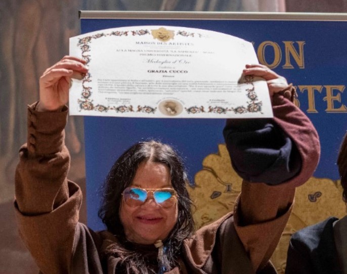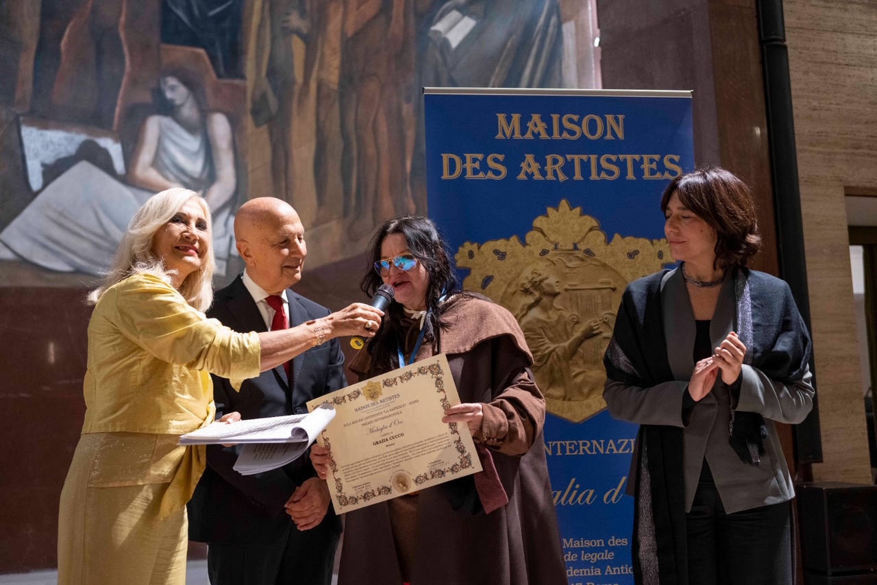 Queste le parole pronunciate dalla giornalista Paola Zanoni leggendo la motivazione per il conferimento del famoso Premio Internazionale Medaglia D’Oro “Maison Des Artistes” a Grazia Cucco, la famosa pittrice amerina che per l’occasione indossava abiti medioevali, suo segno distintivo e iconico, a lei tanto cari.