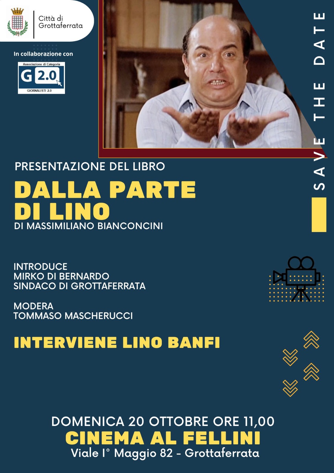 Domenica 20 ottobre 2024 alle ore 11:00, al Cinema Al Fellini di Grottaferrata, in occasione della presentazione del libro di critica cinematografica, “Dalla parte di Lino… Vai avanti, cretino! Apparizione e storia evolutiva della specie banfiota” di Massimiliano Bianconcini, edito da Santelli e dedicato ai personaggi interpretati dal grande Lino Banfi in 27 anni di carriera, dal 1960 al 1987, il Sindaco Mirko Di Bernardo consegnerà all’attore di Andria la Cittadinanza Benemerita per alti meriti artistici. L’evento è moderato da Tommaso Mascherucci. Interviene Lino Banfi. L’evento è in collaborazione con l’Associazione Giornalisti 2.0.