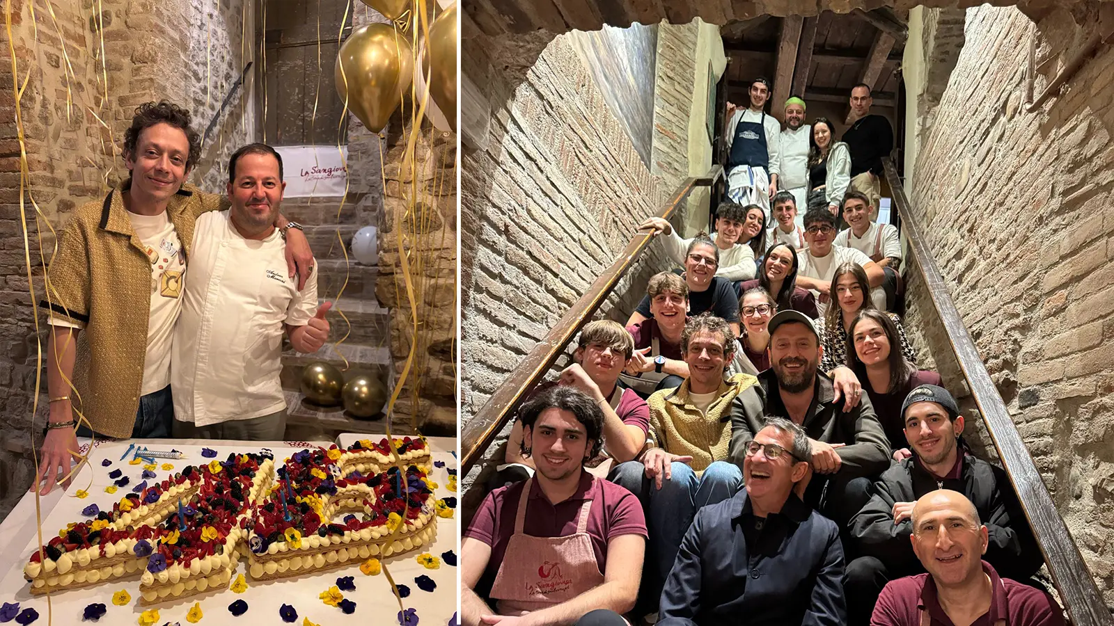 La combriccola si è ritrovata nella saletta riservata di un ristorante addobbata con palloncini oro e bianchi. Il pilota ha festeggiato spegnendo le candeline su una coloratissima millefoglie ai frutti di bosco a forma di numero 46.