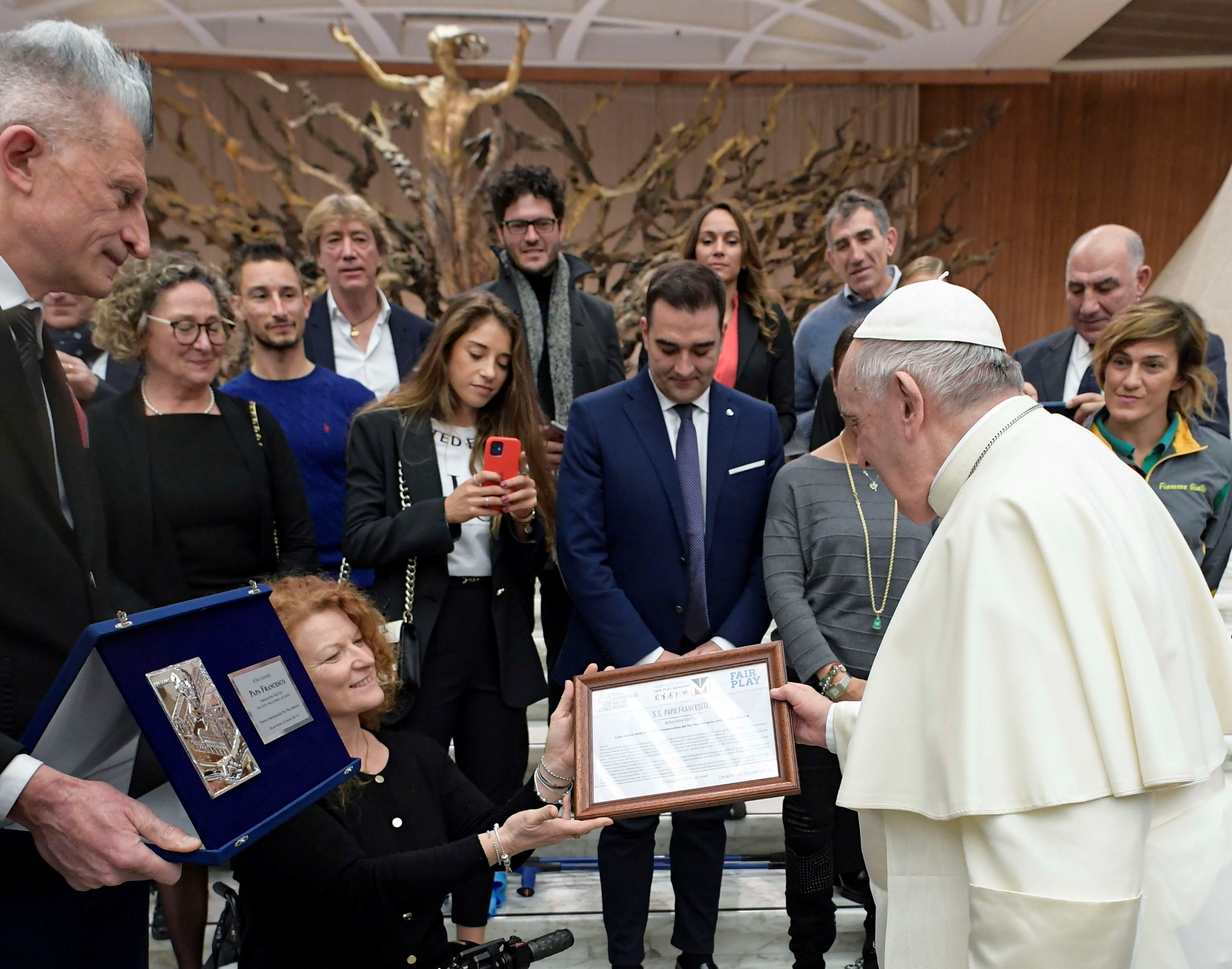 Nel corso dell’udienza, nella Sala Paolo VI, a Papa Francesco è stata consegnata anche la targa e l’attestato di Ambasciatore Fair Play dalle mani dei testimonial Andrea Lucchetta e Francesca Porcellato, in rappresentanza della nutrita delegazione di ambasciatori del Fair Play presente in Vaticano e composta da alcuni premiati dell’albo d’oro delle varie edizioni della manifestazione.