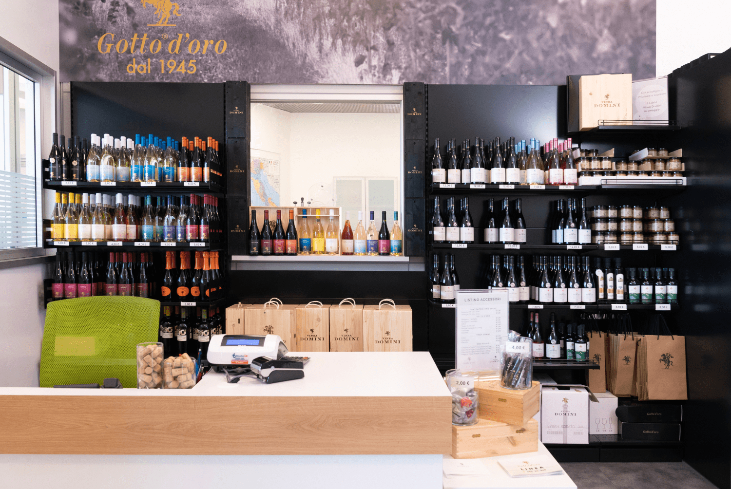 Il punto vendita Gotto d’oro in via del Divino Amore n. 347 a Marino, ubicato all’interno dello stesso stabile della celebre cantina, è un autentico ed ospitale salotto del vino che funge sia da boutique che da elegante biglietto da visita del prestigioso marchio castellano che risulta essere da anni fra le migliori produzioni enologiche nazionali.
