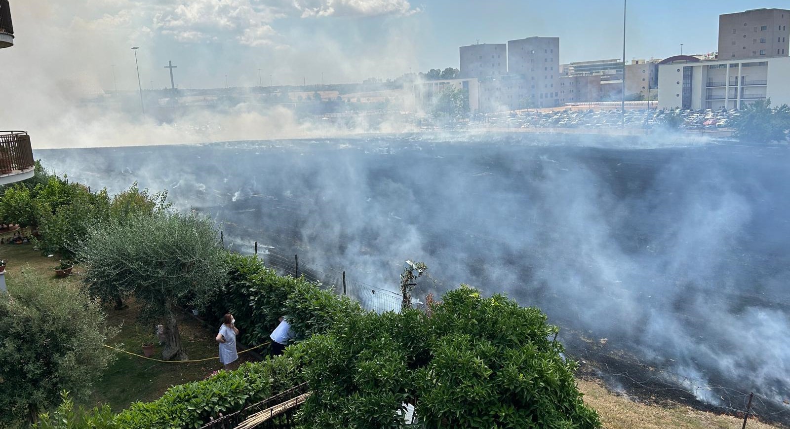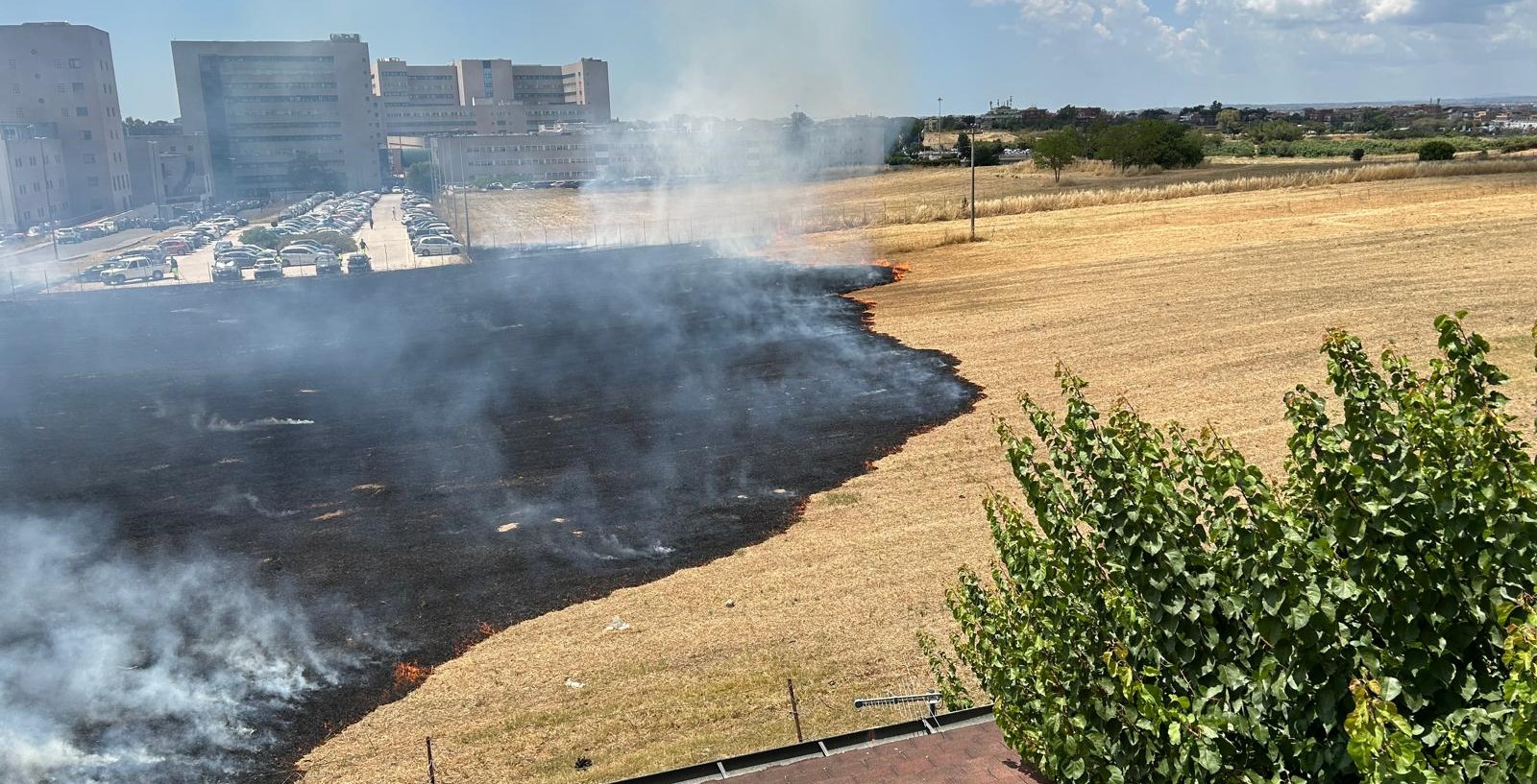 Un terreno adiacente al parcheggio dell'ospedale Tor Vergata ha preso fuoco, probabilmente a causa di una sigaretta ancora accesa gettata incautamente. Le fiamme, alimentate dall'erba alta recentemente tagliata e non completamente rimossa, hanno rapidamente minacciato le abitazioni del Consorzio di Torre Gaia, un'area residenziale confinante con il terreno privato incolto.