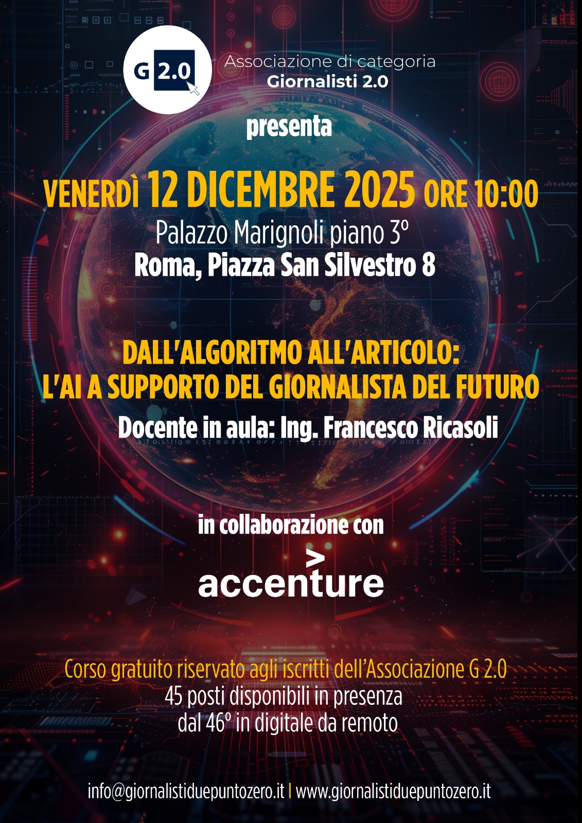 Il mondo del giornalismo si prepara a una svolta epocale grazie all’intelligenza artificiale, con un evento formativo imperdibile organizzato da Giornalisti 2.0 in collaborazione con Accenture: il corso “Dall'algoritmo all'articolo: L’AI a supporto del giornalista del futuro”, in programma venerdì 12 dicembre 2025 presso Palazzo Marignoli, Roma, Piazza San Silvestro 8.