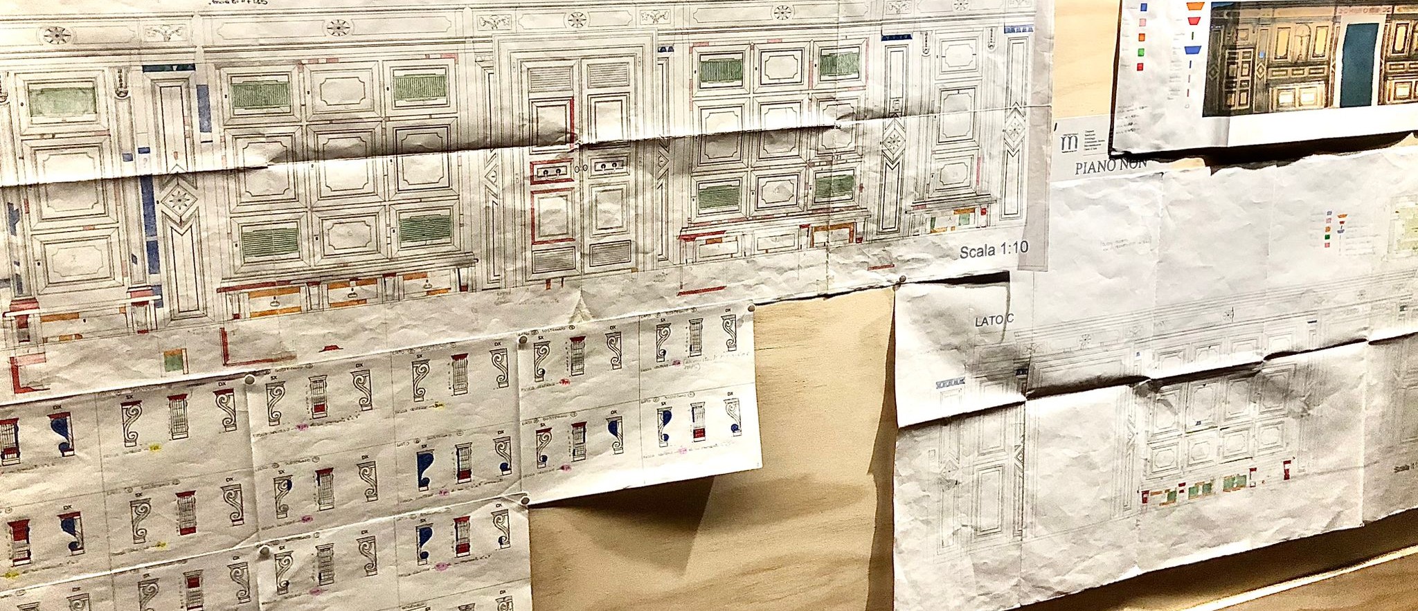 La boiserie in restauro è un'opera straordinaria, realizzata da ebanisti dotati di grande maestria e profonda conoscenza delle specie legnose più pregiate. La struttura è composta da un telaio in legno massello rivestito con essenze nobili quali ebano, palissandro, bois de rose, mogano e bosso. Questi materiali, oltre a essere difficili da reperire, comportano costi elevati e richiedono tecniche sofisticate per essere lavorati. In particolare, il palissandro, noto per la sua rarità e bellezza, ha rappresentato una delle principali sfide di approvvigionamento.