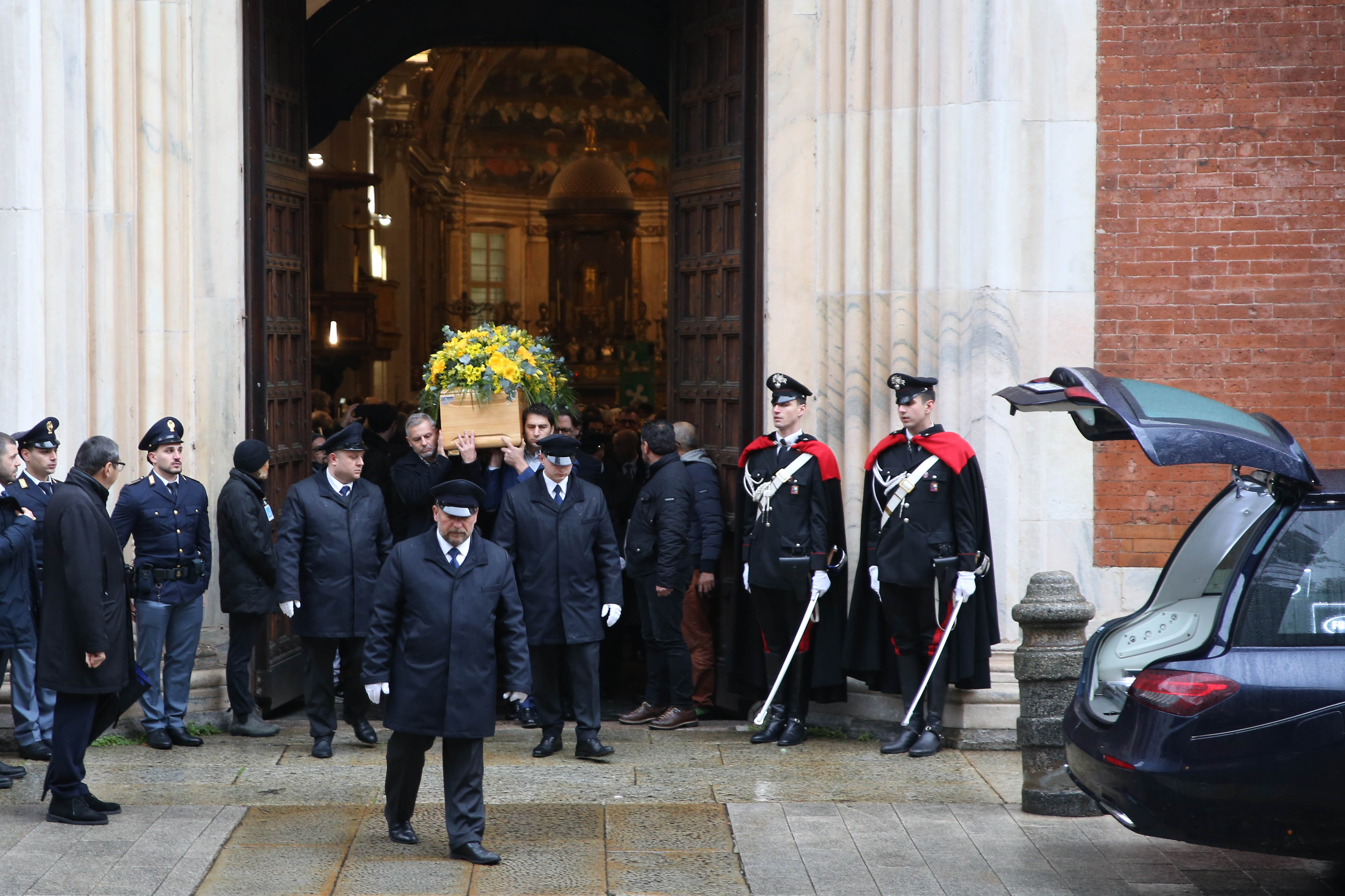 Sulla bara di legno è stata appoggiata una grande composizione di fiori gialli. A officiare le esequie è don Luigi Garbini.
