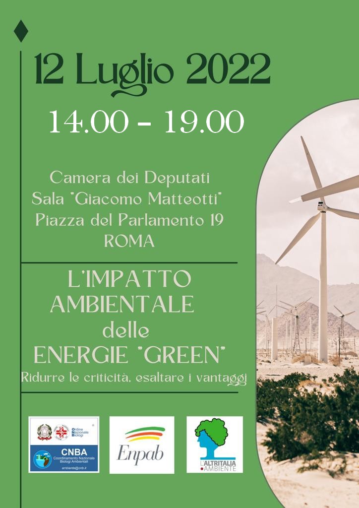 L'impatto Ambientale delle Energie Green, questo il titolo della Tavola Rotonda organizzata da L'Altritalia Ambiente, ONB (Ordine Nazionale dei Biologi) ed ENPAB (Ente Nazionale Previdenza Assistenza Biologi), che si terrà martedì 12 luglio dalle ore 14,00 presso la Sala Matteotti della Camera dei Deputati.