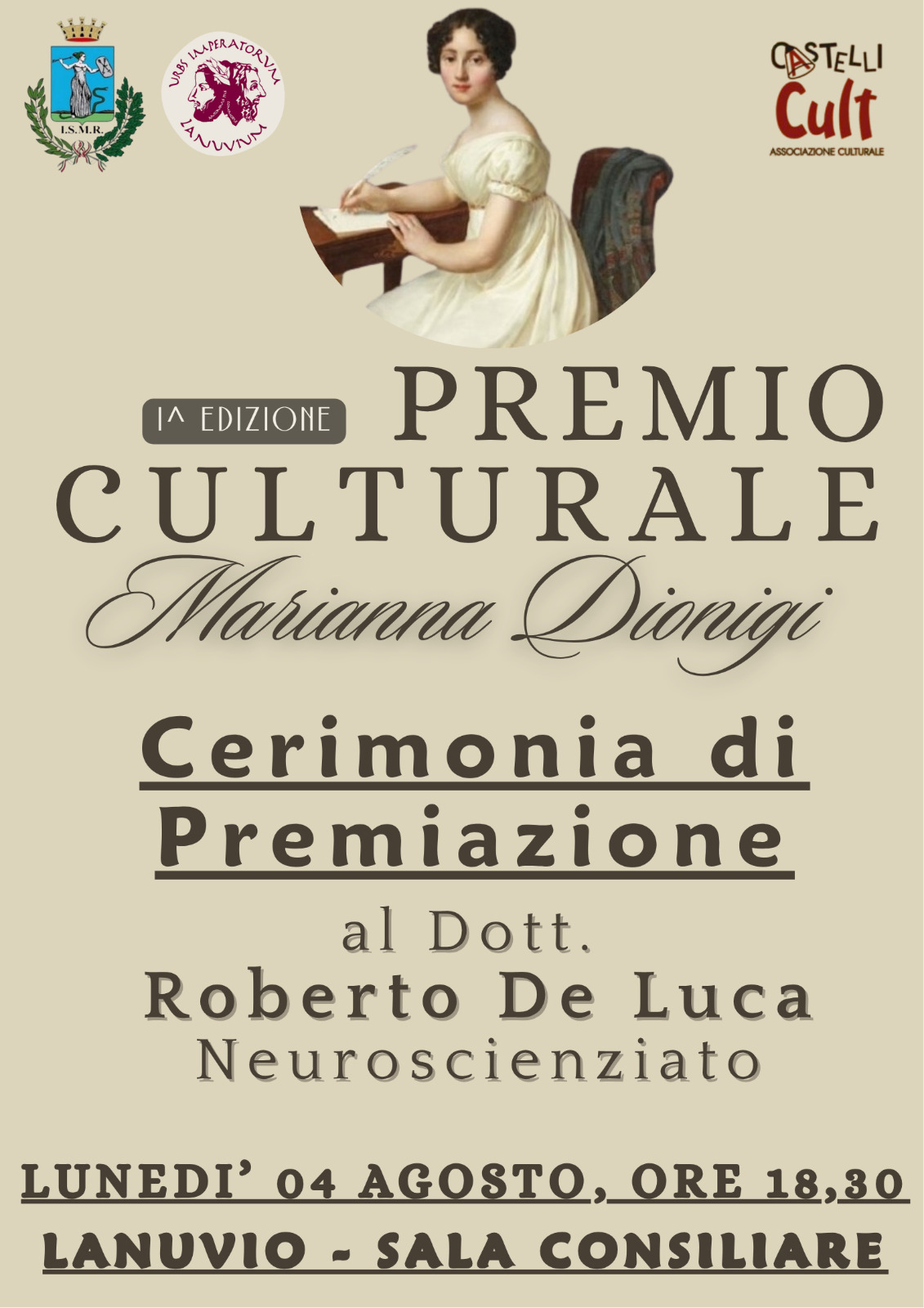L’Associazione culturale Castelli Cult ETS, in collaborazione con l’Assessorato alla Cultura del Comune di Lanuvio, presenta la *prima edizione del Premio culturale “Marianna Dionigi”, dedicato alle eccellenze giovanili nel campo della ricerca, dello studio e della creatività.