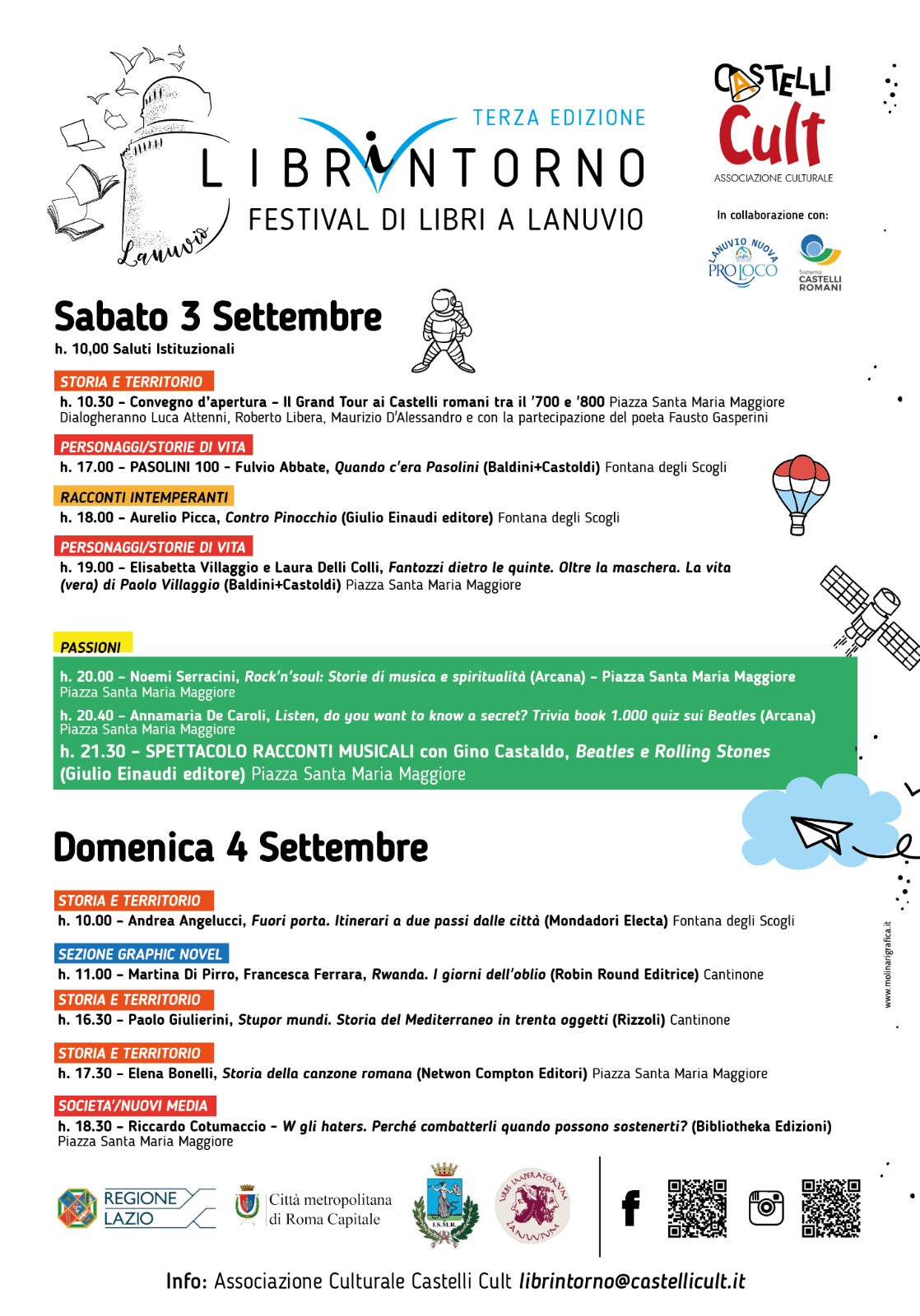 La manifestazione, organizzata dal Comune di Lanuvio e a cura dell’associazione Castelli Cult, con il sostegno della Lanuvio Nuova Pro Loco, del Consorzio SCR e il patrocinio della Regione Lazio e di Città Metropolitana, coinvolgerà una gran fetta di pubblico grazie ad un programma ricco di generi diversi e autori importanti.