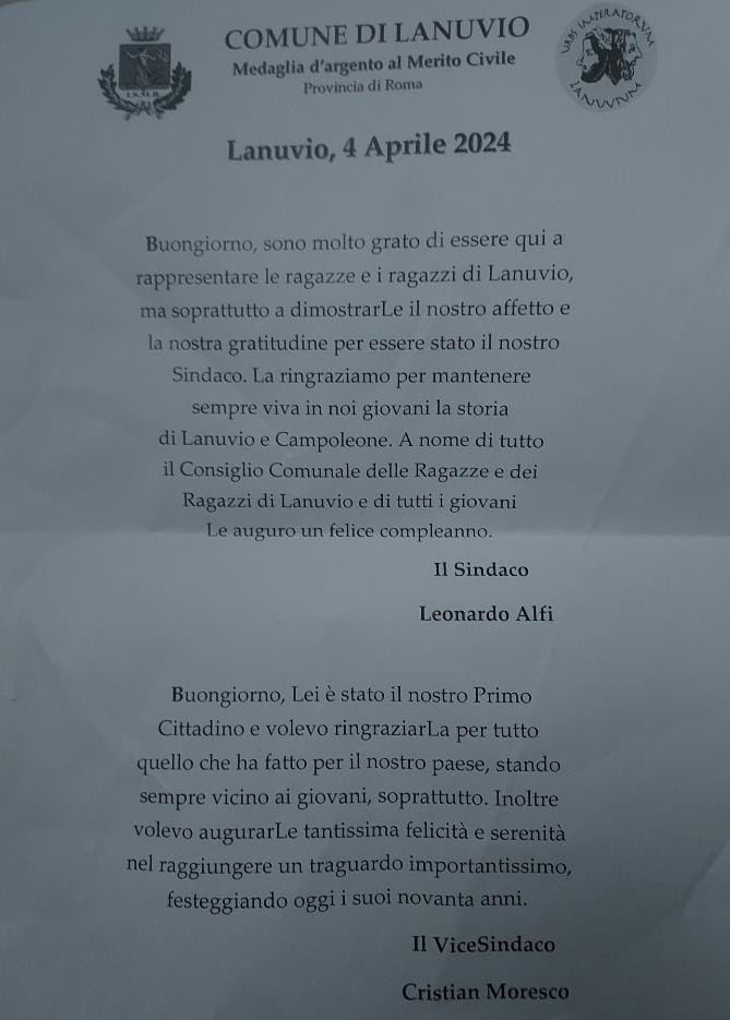 Nel pomeriggio di giovedì 4 aprile 2024, in occasione del festeggiamento del novantesimo anno di età da parte dell'ex Sindaco Leonio Evangelista, una delegazione comunale costituita dal Presidente del Consiglio Alessandro De Santis, dall'Assessore alla Pubblica Istruzione Irene Quadrana, dal Consigliere Delegato alle Politiche Giovanili Tiziano Pontieri, e anche dai neoeletti Sindaco e Vice Sindaco del Consiglio Comunale delle Ragazze e Ragazzi, Leonardo Alfi e Cristian Moresco, gli ha reso visita nella sua casa per un augurio in virtù dell'importante traguardo raggiunto e per un ringraziamento del suo costante lavoro sulla memoria della città di Lanuvio.