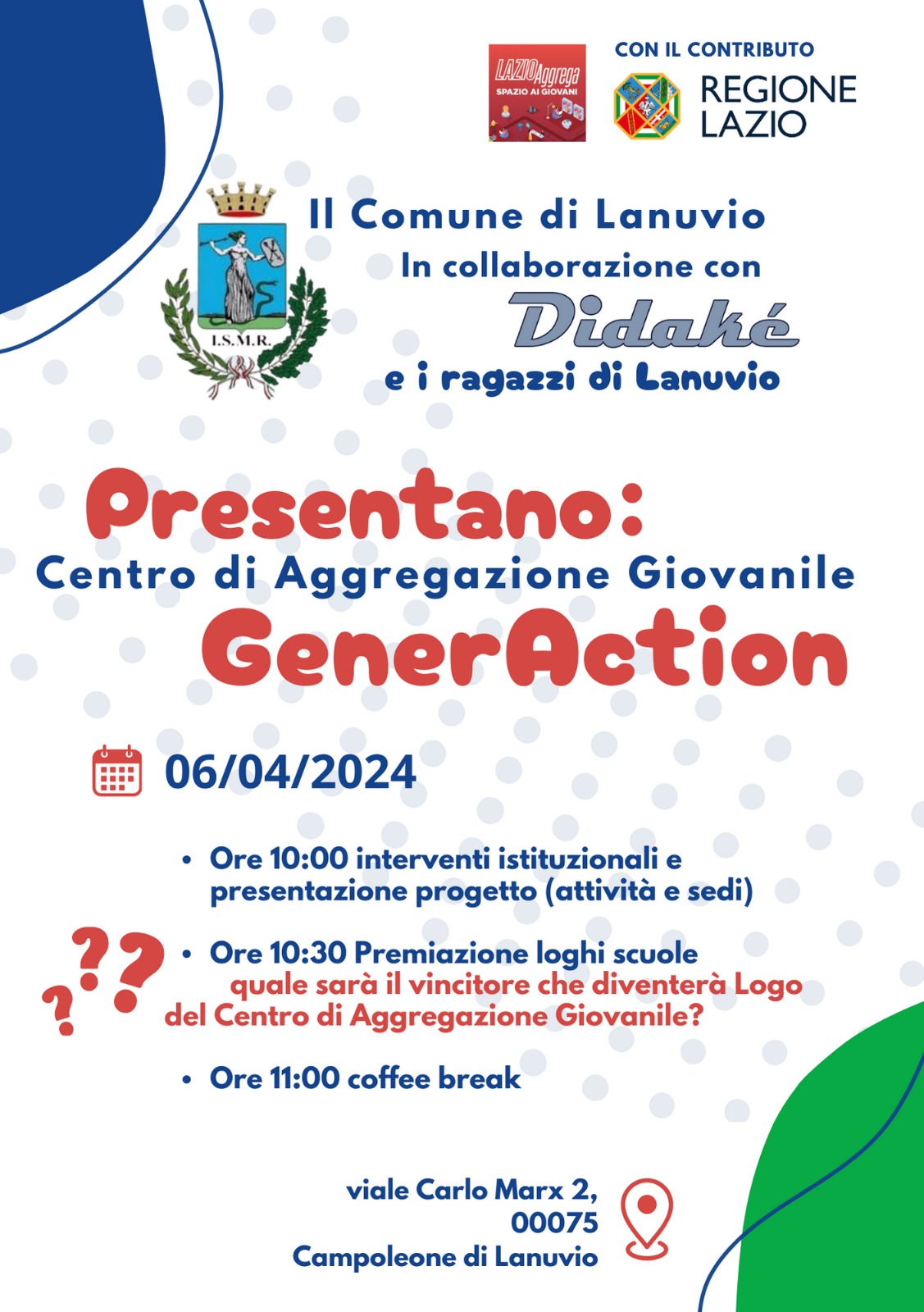 Sabato 6 aprile 2024 sarà presentato a Lanuvio il progetto di “GenerAction” il nuovo centro di aggregazione giovanile che sarà realizzato anche grazie al contributo che il comune si è aggiudicato partecipando al bando della Regione Lazio “LazioAggrega”.