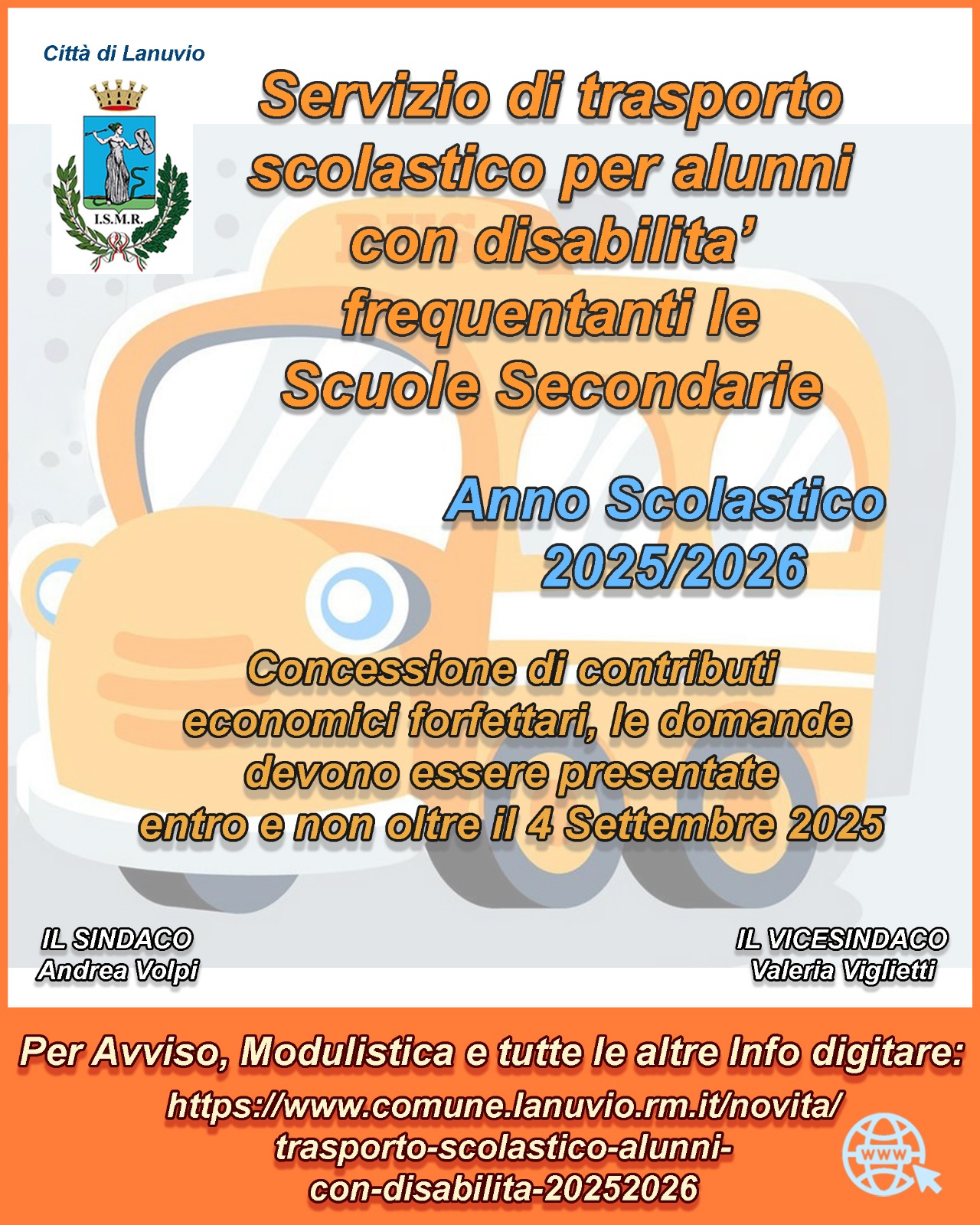 "Il Comune di Lanuvio informa che, grazie al finanziamento della Regione Lazio, è attivo per l’anno scolastico 2025/2026 il servizio di trasporto scolastico dedicato agli studenti con disabilità residenti nel Comune e iscritti alle scuole secondarie di secondo grado statali o paritarie, oppure ai percorsi triennali di IeFP (Istruzione e Formazione Professionale).