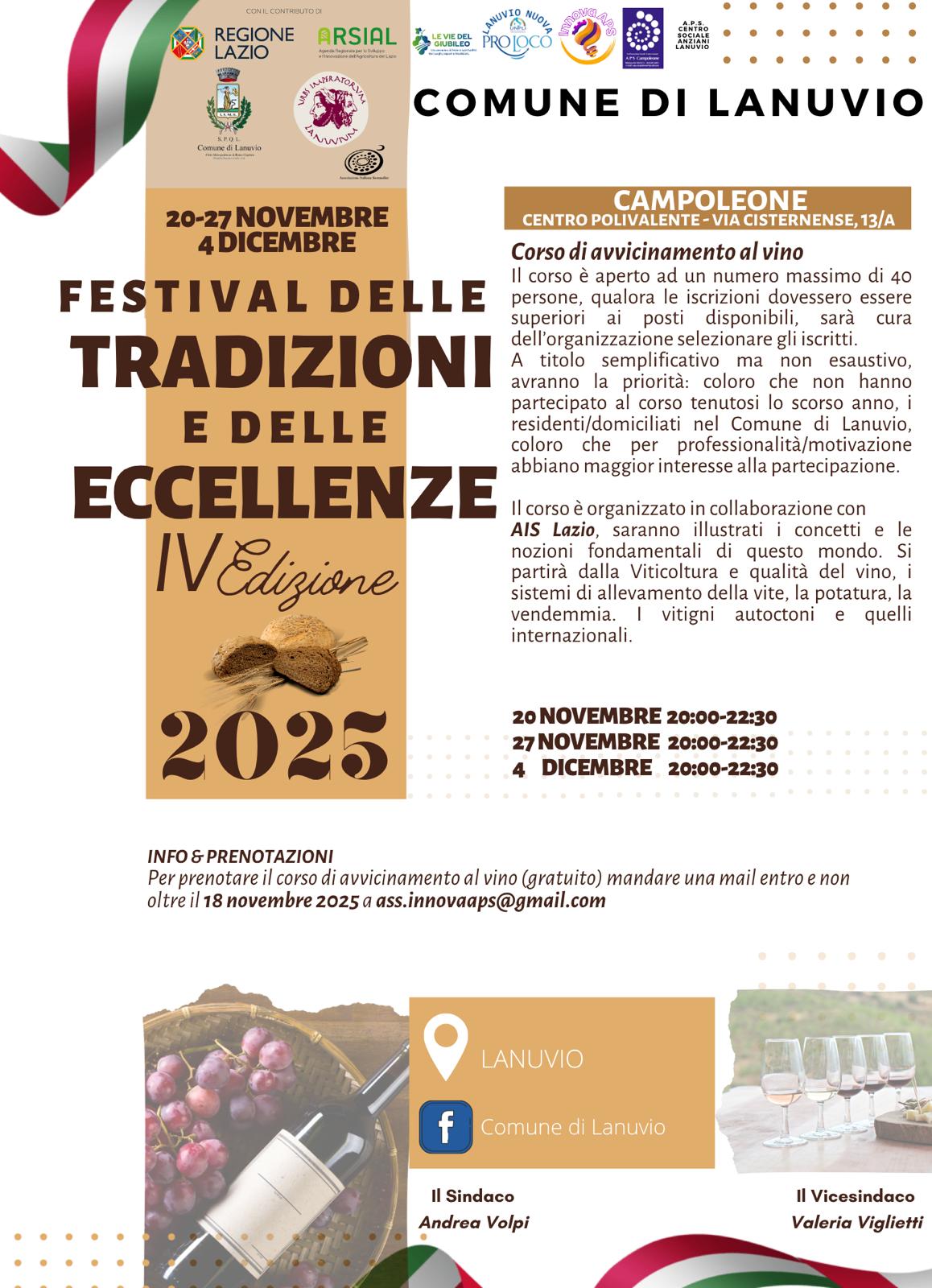 • Il corso di formazione ricerca sperimentazione e promozione dei prodotti enogastronomici si terrà presso la Sala delle Colonne nei giorni 2, 9, 12 dicembre. Le iscrizioni potranno essere effettuate scrivendo a lanuvionuovaproloco@gmail.com, fino ad esaurimento posti.