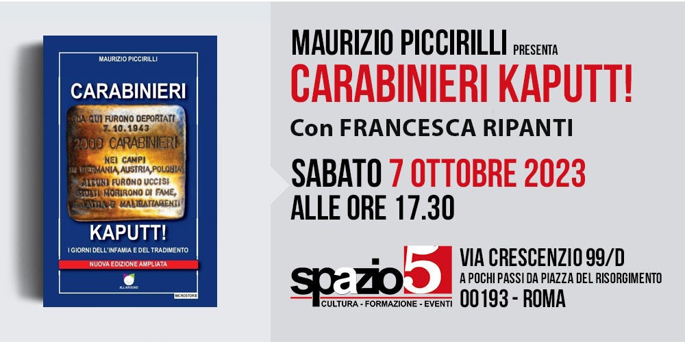 Sarà presentato sabato 7 ottobre alle ore 17.30 allo Spazio5 di Roma (via Crescenzio 99/d, ingresso gratuito), "Carabinieri Kaputt", il libro di Maurizio Piccirilli sul rastrellamento e la deportazione dei carabinieri. Quest' anno ricorre l'80° anniversario di quell' evento.