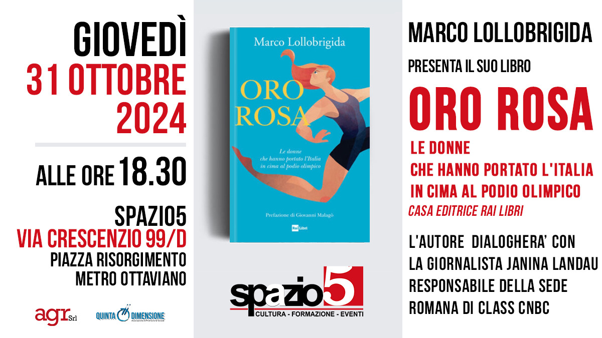 Il 31 ottobre 2024, alle ore 18:30, presso lo Spazio5 di Via Crescenzio a Roma, Marco Lollobrigida presenterà il suo nuovo libro “Oro Rosa: Le donne che hanno portato l’Italia in cima al podio olimpico” (Rai Libri).