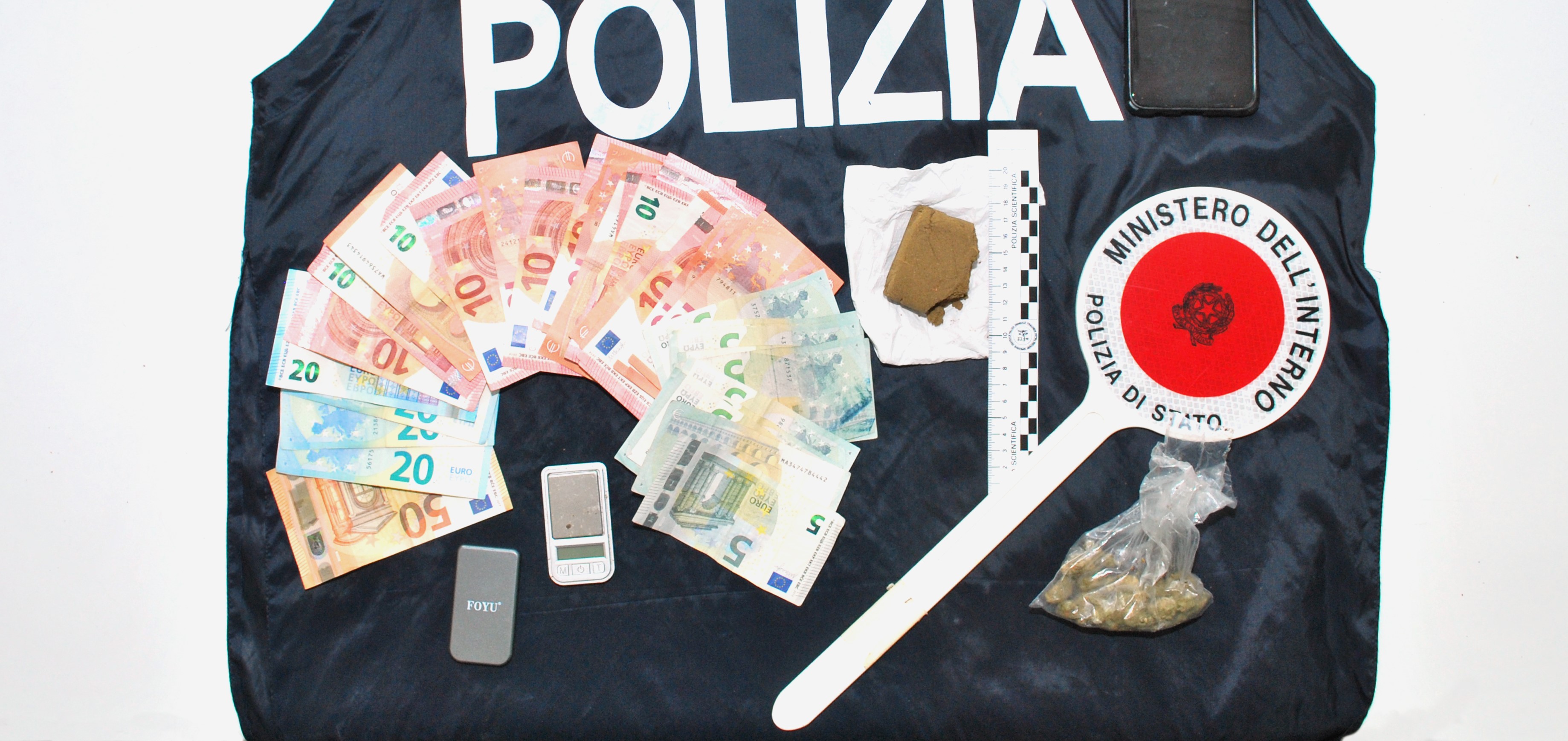 Nel primo, ad uso esclusivo dell’arrestato, che indosso deteneva 0,95 gr. di hashish, sono stati rinvenuti ulteriori 64,12 gr. di hashish in più pezzi e 5,52 gr. di marijuana, oltre ad un bilancino di precisione, un trinciatore utilizzato generalmente per la marijuana, materiale per il confezionamento della sostanza, nonché 390 euro (in banconote da 5, 10 e 20 euro), somma probabile provento di attività di spaccio.