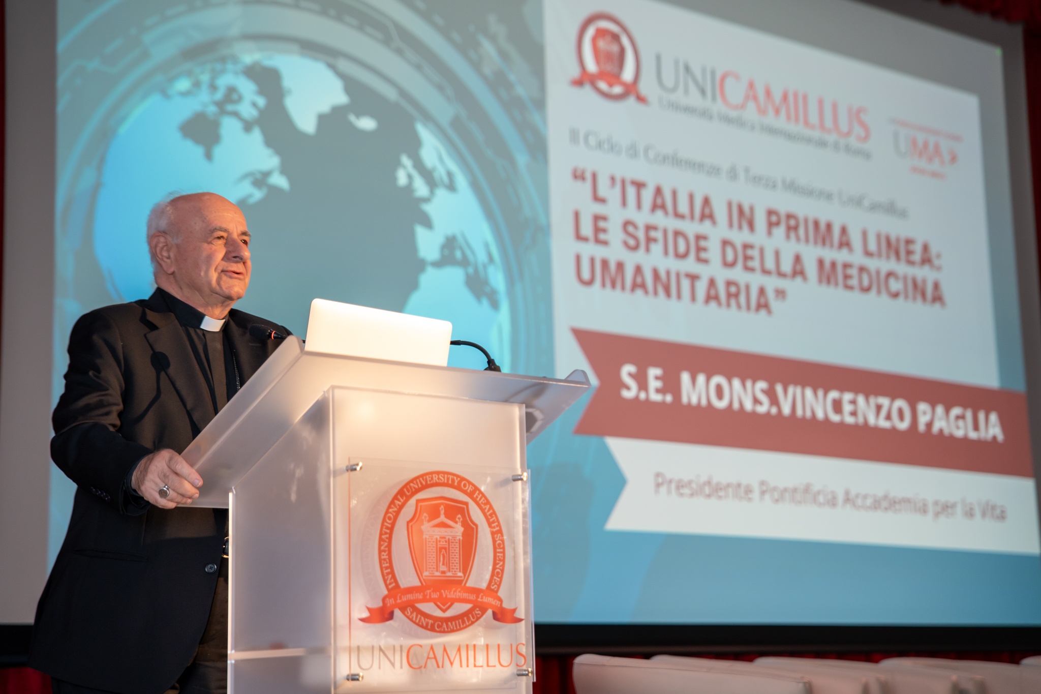 «Il medico fa la differenza quando opera in chiave umanitaria – esordisce Gianni Profita, Rettore UniCamillus che ha aperto il convegno – Sono fiero che l’Università UniCamillus, con la sua vocazione internazionale e umanitaria, contribuisca a formare tale consapevolezza». Una vocazione che dovrebbe essere normale, eppure non lo è. Come sottolinea il Mons. Vincenzo Paglia, Presidente della Pontificia Accademia per la Vita, «oggi si globalizzano guerre ed egoismo, per questo la sfida della medicina umanitaria è quella di salvarci tutti, partendo dai più deboli». Questo può avvenire solo unendo le forze, come sostiene Cristiano Camponi, Direttore Generale dell’INMP – Istituto Nazionale per la promozione della salute delle popolazioni Migranti e per il contrasto alle malattie della Povertà, ente del SSN: «Istituzioni, enti del Terzo Settore, università: tutti possono contribuire a mettere al centro il paziente, tenendo conto sia della sua salute fisica che delle sue peculiarità umane, psicologiche e sociali».