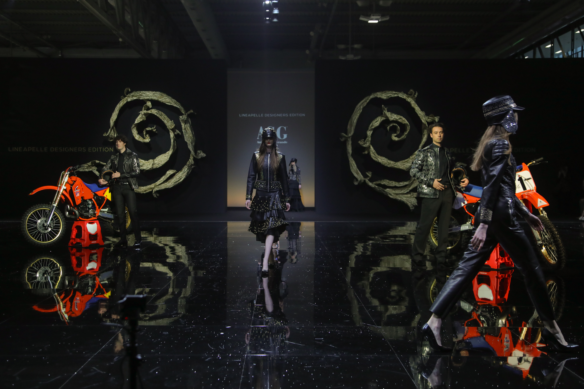La sfilata organizzata in collaborazione con Lineapelle-Unic Concerie Italiane è stata un tripudio con gli straordinari capi in pelle che hanno trasformato questo materiale in puro glamour ad alto tasso di seduzione, persino con i caschi indossati da modelle e modelli sulla passerella.