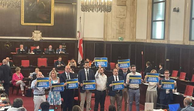 I consiglieri hanno occupato il centro dell'aula per alcuni minuti, mostrando un cartello con la scritta "dimissioni" e appoggiando scatolini sui banchi per "il trasloco di Sala". Contestazioni anche da parte del pubblico: "A casa".