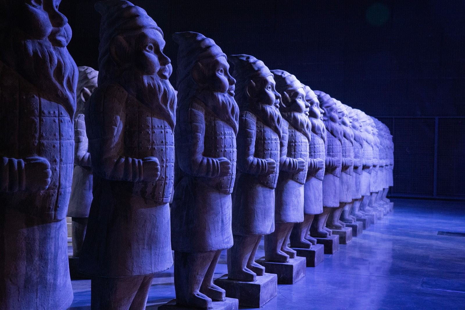 "Extinction" è la nuova mostra di Max Papeschi, allestita alla "Porta di Milano" al Terminal 1 fino all'11 aprile, curata da Stefania Morici, che racconta la guerra e l’impoverimento culturale con l’installazione di 54 statue, alte quasi due metri, con il corpo che ricorda il famoso esercito dei guerrieri di terracotta di Xi’an e con le teste dei simpatici nani da giardino.