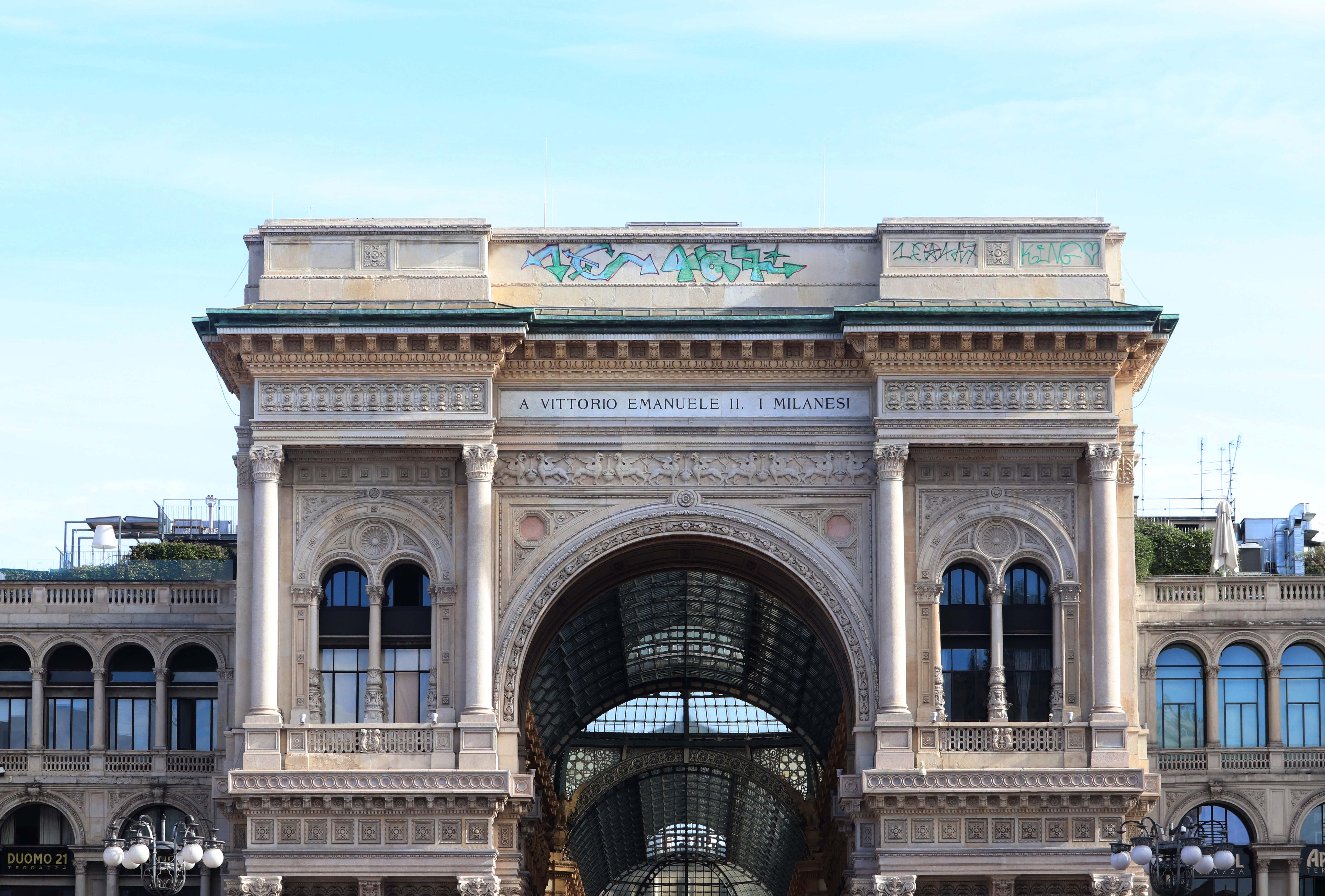 Un atto vandalico è stato compiuto ieri sera in pieno centro a Milano, dove alcuni writers hanno imbrattato il frontone d'ingresso della Galleria Vittorio Emanuele con una scritta visibile anche da Piazza Duomo.