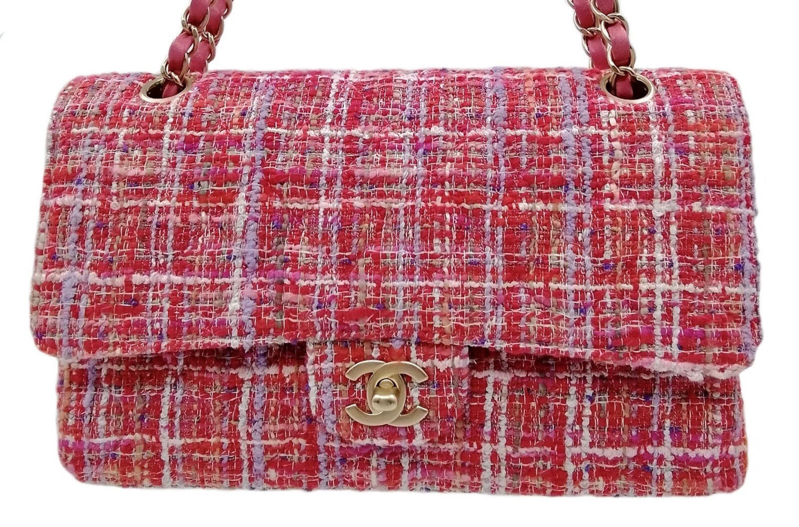 Si tratta di una versione della borsa matelassé in tweed rosa, rosso, bianco con catena a doppio scorrimento intrecciata con pelle rosa. Hardware oro. Chiusura con doppia C. Interni in pelle di agnello rosa. Made in France 2004.