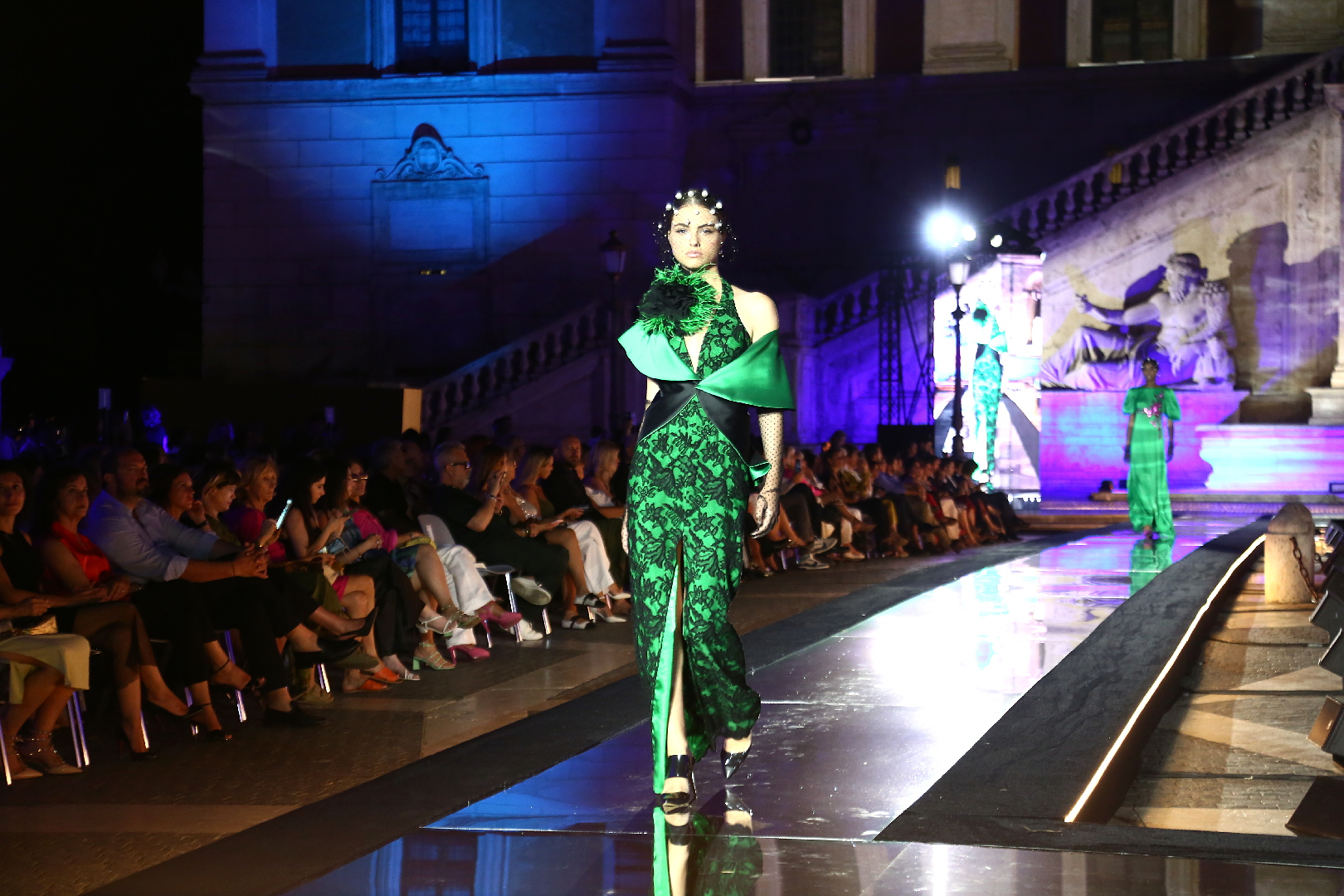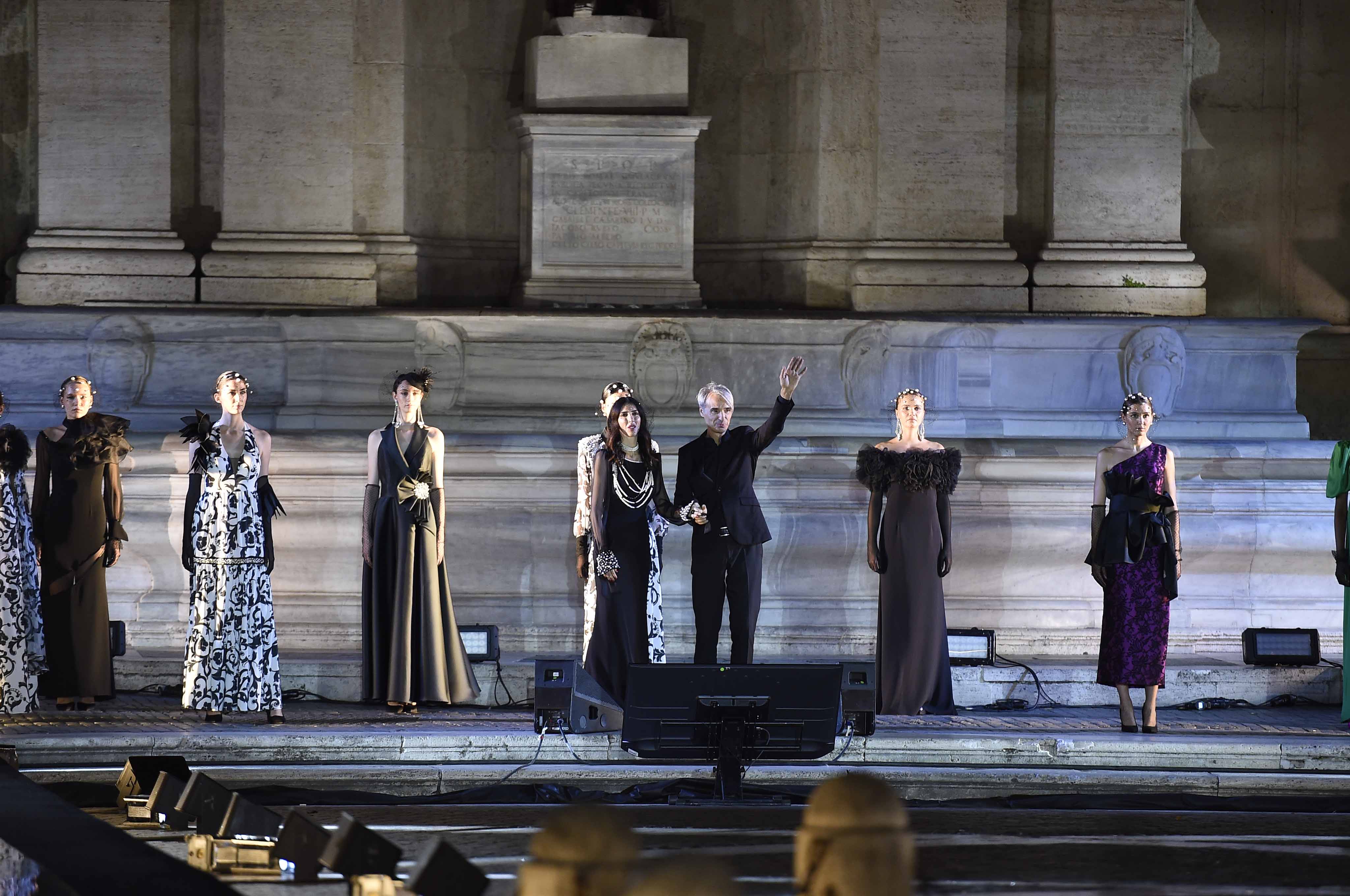 Lo stilista napoletano è da anni di casa nella Capitale con al suo atelier in Via del Babuino. Le sue apprezzate creazioni sono ideate per una donna sofisticata, mentalmente matura che incede con naturalezza tra le stanze dei palazzi nobiliari, ma anche alle prime teatrali e alle serate di gala. Ed ecco che nel catwalk, ad interpretarle, è stata la splendida ed eterea principessa Giacinta Ruspoli.