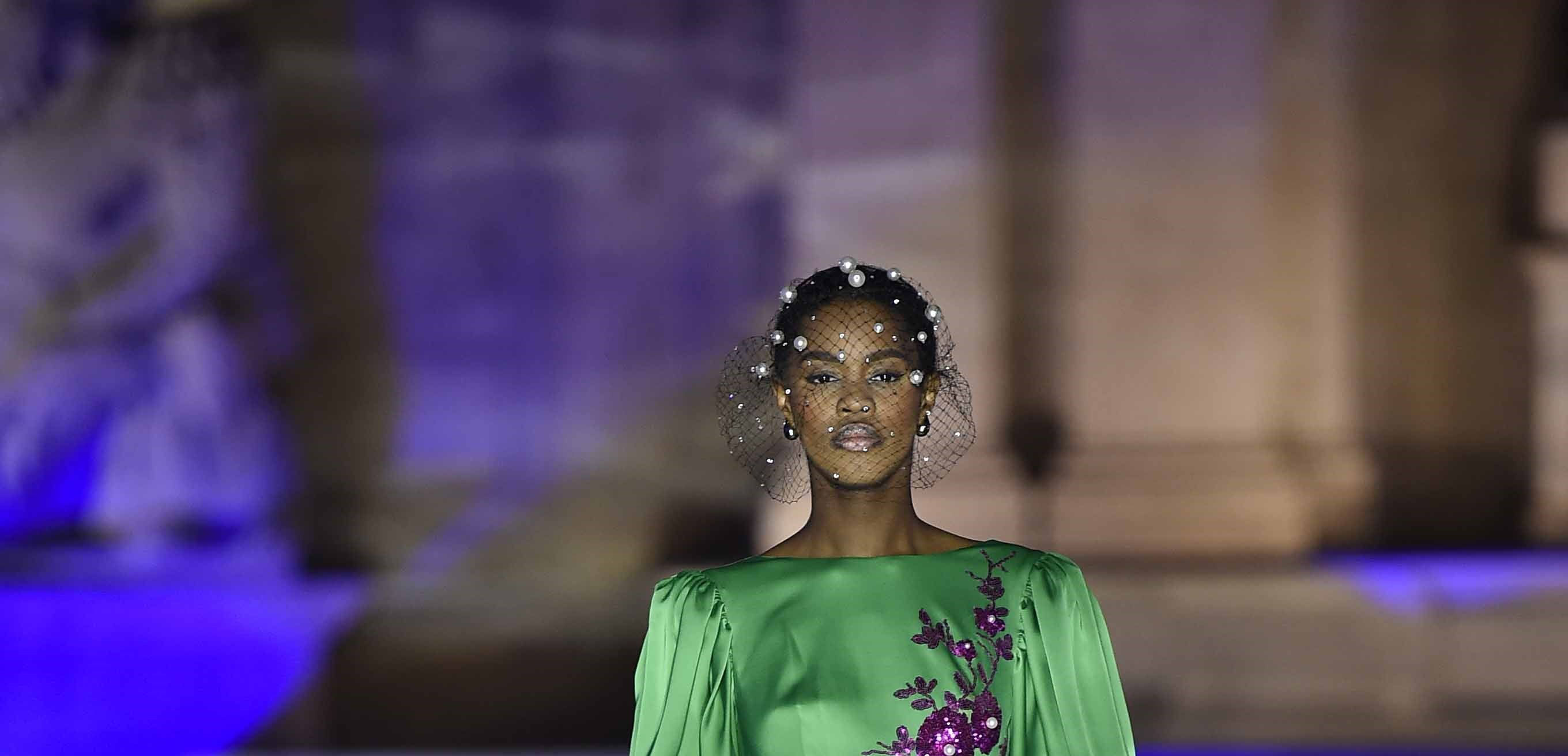 Superlativi i long dress in cui il mikado fascia la silhouette con pizzi chantilly a contrasto, ma anche abiti in satin morbidi sia in tinta unita che in stampe bianche e nere disegnate dallo stesso couturier. La palette cromatica predominante è quella dei bianchi e dei neri coadiuvati da un bellissimo verde smeraldo e dal ciclamino.