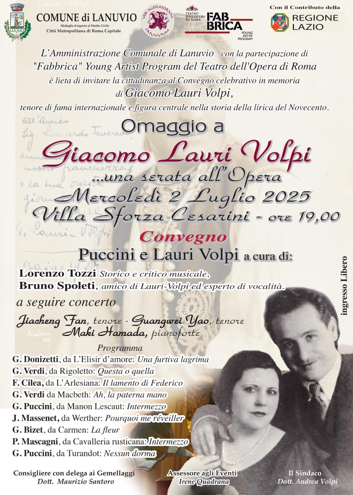 Nel cartellone dell’Estate Lanuvina 2025, con il contributo della Regione Lazio, il Comune di Lanuvio propone una serata di grande valore artistico e culturale dedicata alla figura di Giacomo Lauri Volpi, uno dei più grandi tenori del Novecento e figlio illustre della città, dove nacque nel 1892.