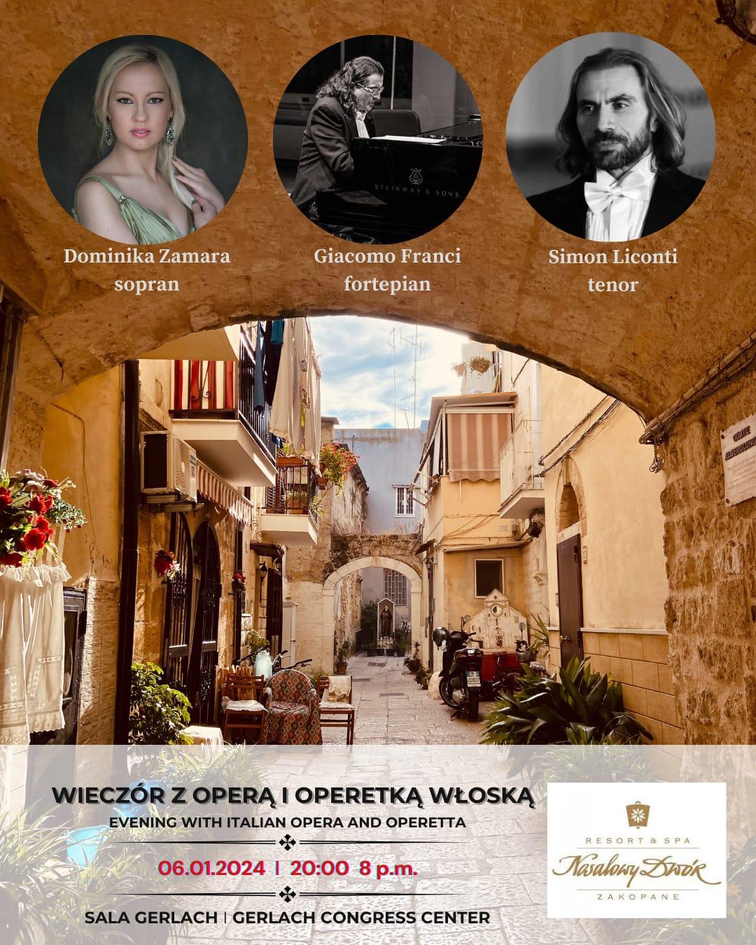Sarà il 6 gennaio 2024, data in cui Zakopane sarà la cornice di questo concerto che vedrà impegnati il Maestro Giacomo Franci, che al pianoforte eseguirà dei brani di Chopin e assieme alle voci del soprano Dominika Zamara e al tenore Simone Liconti interpreteranno arie e duetti.