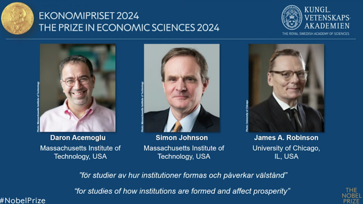 Daron Acemoglu, Simon Johnson e James A. Robinson ricevono il Premio Nobel per l'Economia per i loro "studi sulla formazione delle istituzioni e la loro influenza sulla prosperità" nei Paesi del mondo.