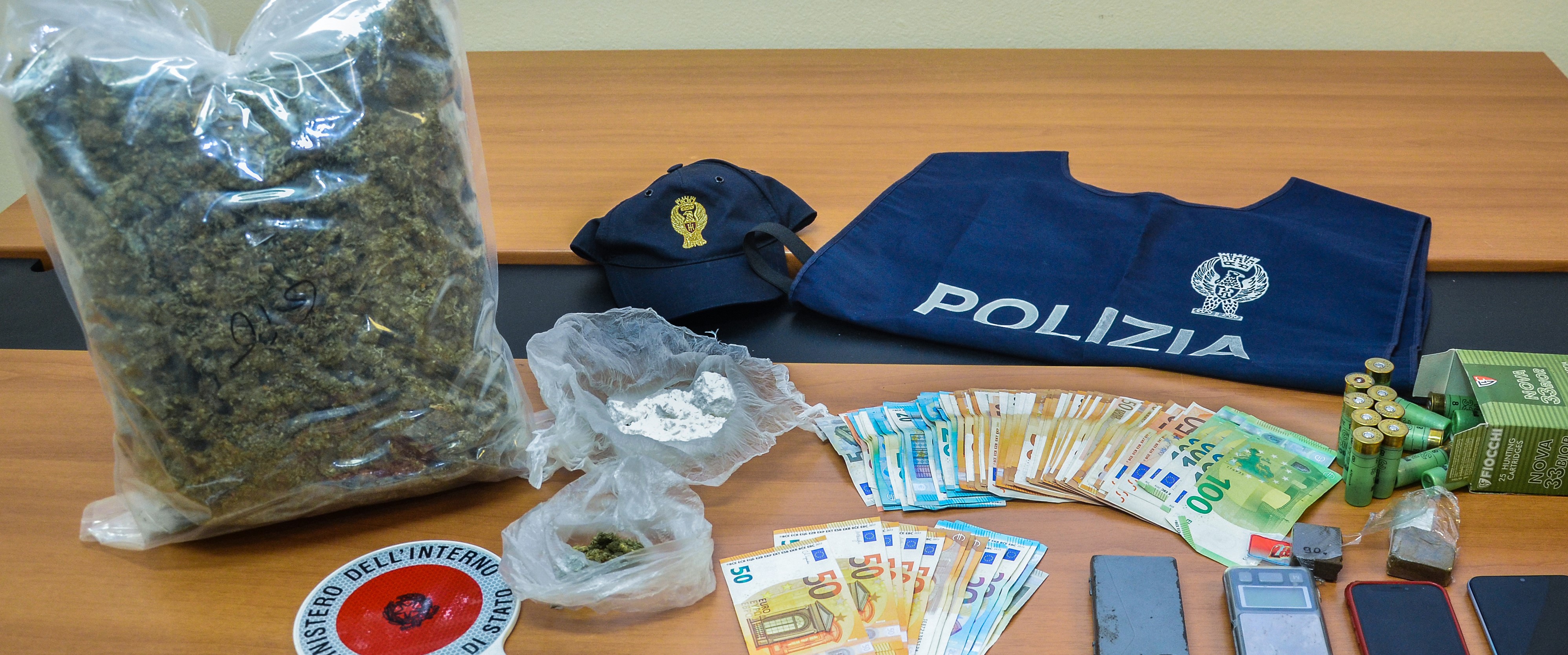 Trovati 4 mila euro, 1 kg di marijuana, 1 etto di cocaina, 40 grammi di hashish, bilancini di precisione, materiale per il confezionamento della droga, e alcune munizioni illegalmente detenute.