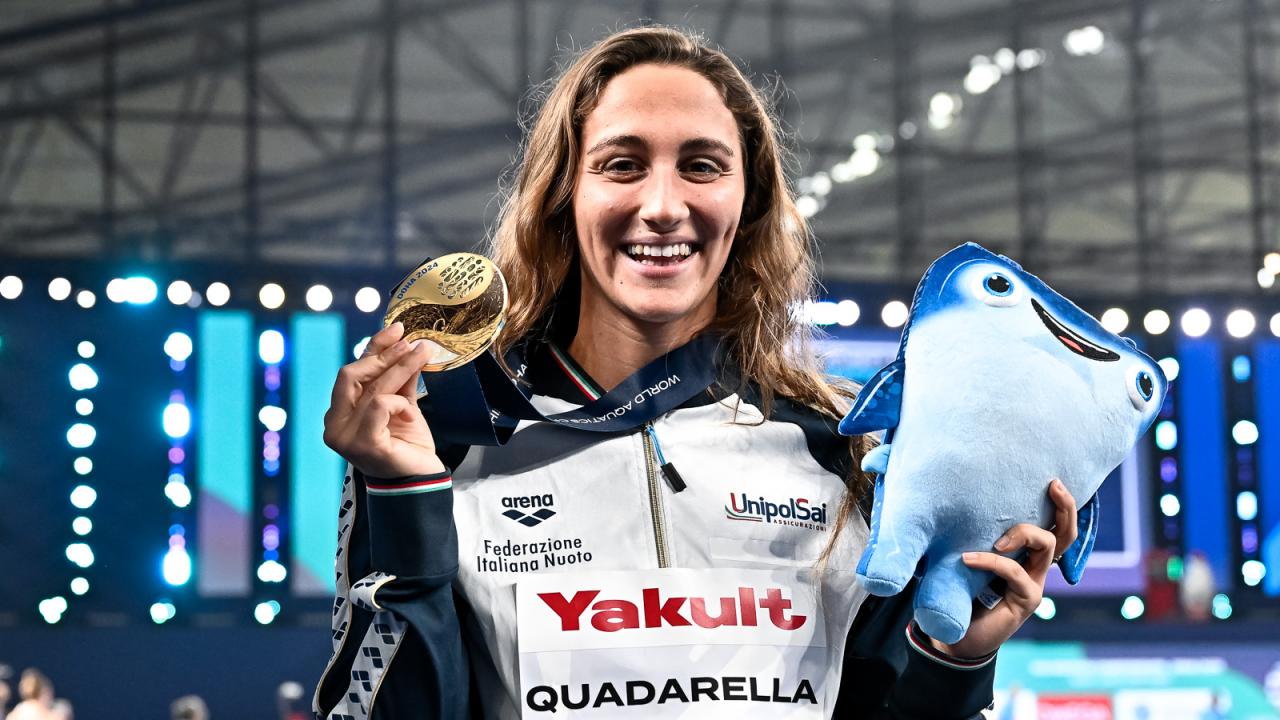 Quadarella imperatrice. La regina del mezzofondo europeo si è ripresa il mondo e proverà a conquistare tra sei mesi il podio alle Olimpiadi di Parigi. Simona Quadarella compie l’impresa, approfitta, come avvenne a Gwangju 2019 quando portò il record italiano a 15'40"89, dell’assenza della statunitense pluricampionessa olimpica e del mondo Katie Ledecky, e vince l'oro nei 1500 stile libero. Strepitosa la finale della 24enne romana e tricampionessa europea in carica - tesserata per CC Aniene, allenata da Christian Minotti - che conduce trenta vasche a 31"8-31"9 di media e nuota in 15'46"99 nettamene più veloce del tempo limite olimpico (15'55"0).