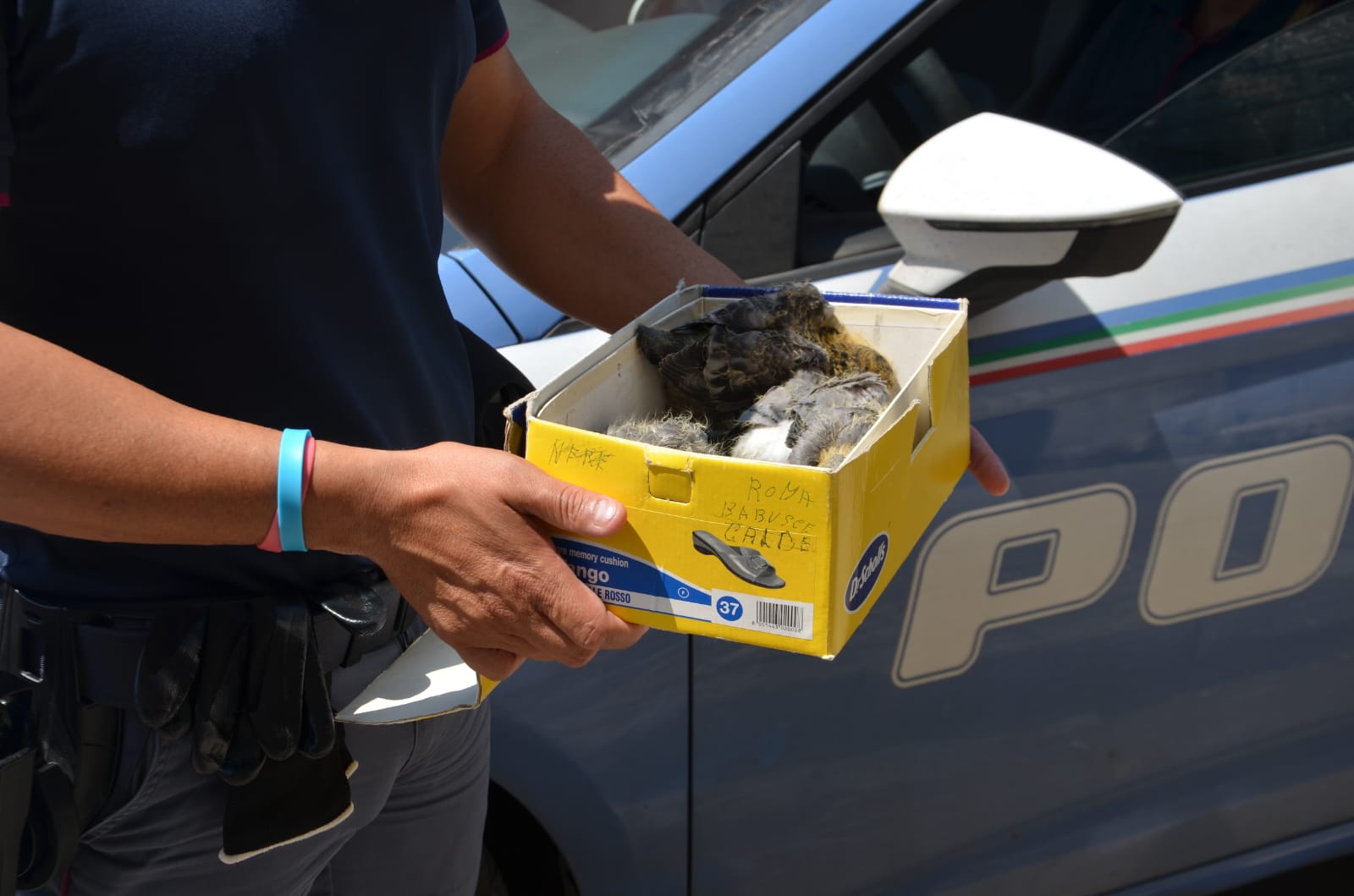 Gli agenti hanno subito appurato che si trattava di una scatola di scarpe di cartone con all'interno quattro piccoli di tortora evidentemente abbandonati.