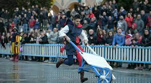 Gli animali, prelevati dal loro ambiente naturale, vengono portati su una sorta di carretti (una rana per ogni carretto), spinti correndo dai concorrenti, consacrando vincitore il primo arrivato. Durante questa assurda manifestazione le rane continuamente tentano di scappare saltando a terra, il concorrente si ferma, le raccoglie, le riposiziona e poi riparte con il carretto. Le sopravvissute vengono rimesse in libertà.