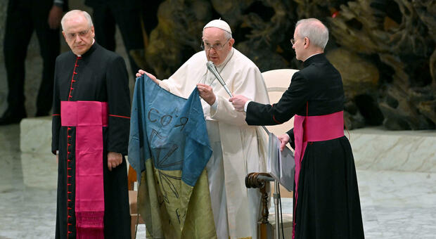 Nel corso dell'udienza generale di oggi all'interno dell'Aula Paolo VI, in Vaticano, Papa Francesco ha fatto vedere una bandiera dell'Ucraina, proveniente da Bucha.