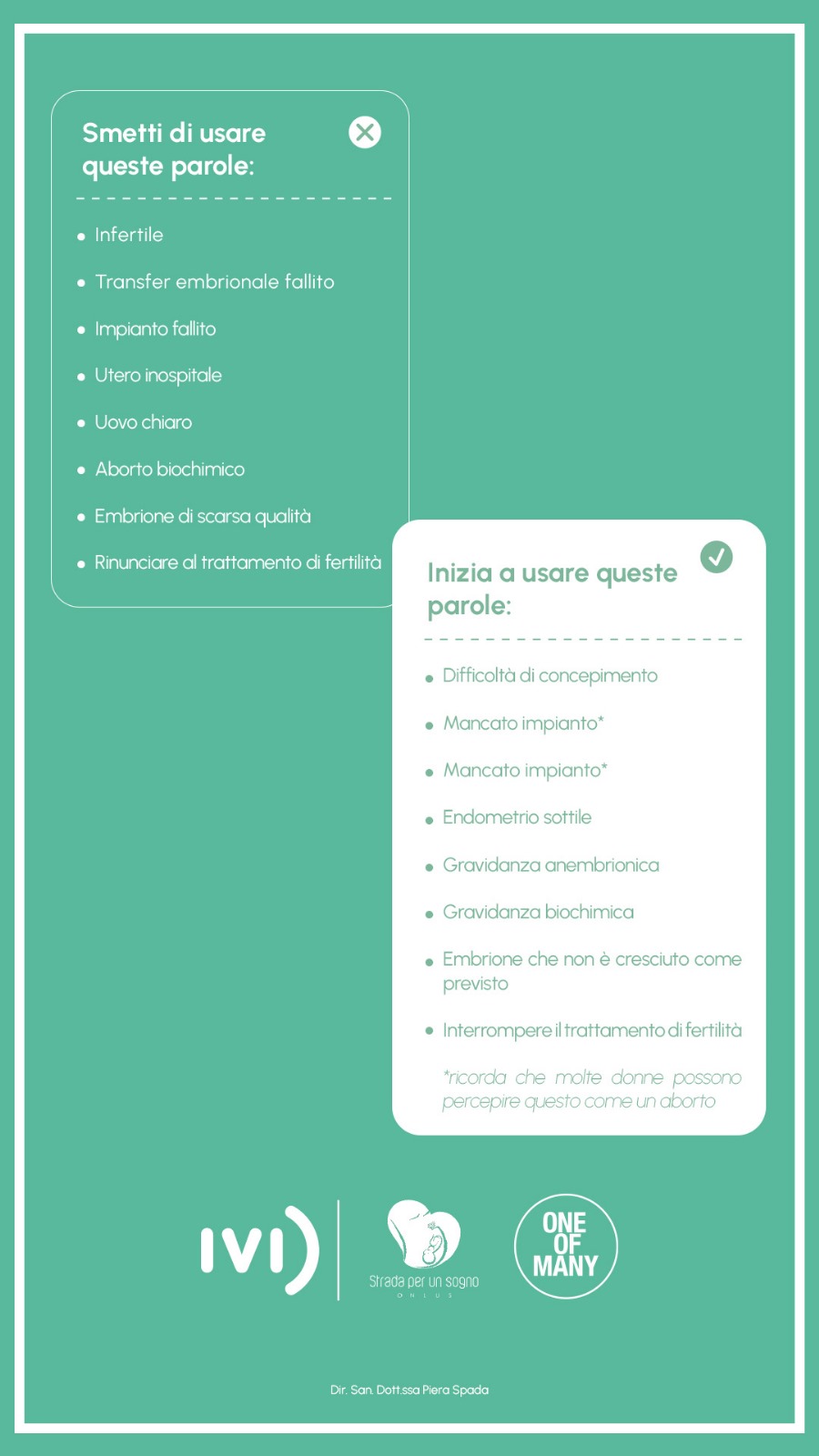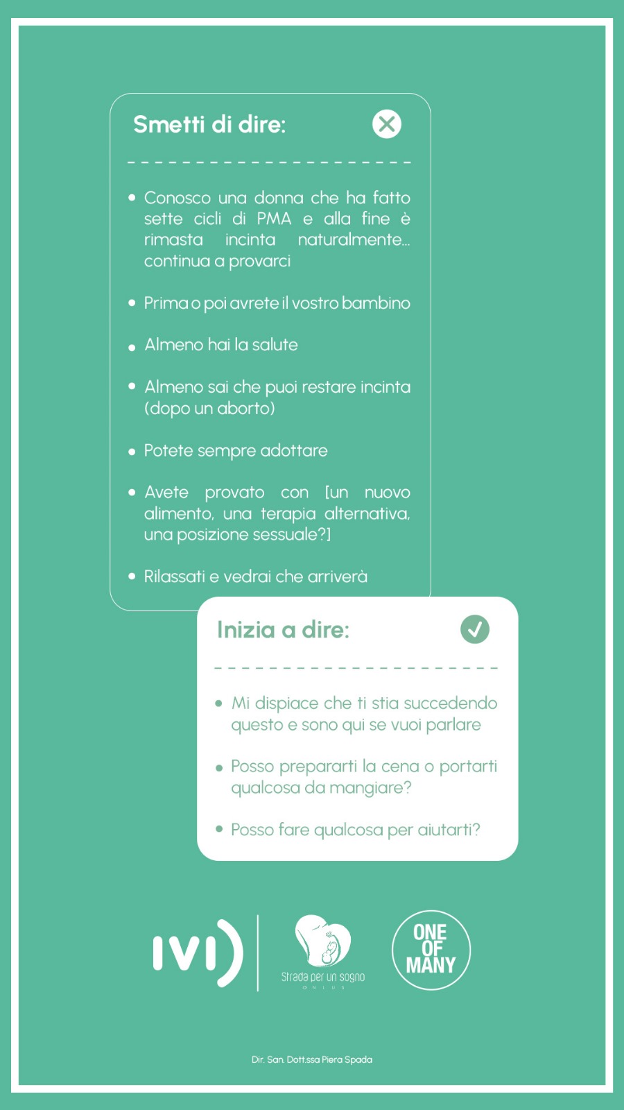 - sensibilizzare sul potere delle parole, diffondendo consapevolezza riguardo le espressioni che possono ferire chi affronta l’infertilità e quelle che invece esprimono vicinanza ed empatia;