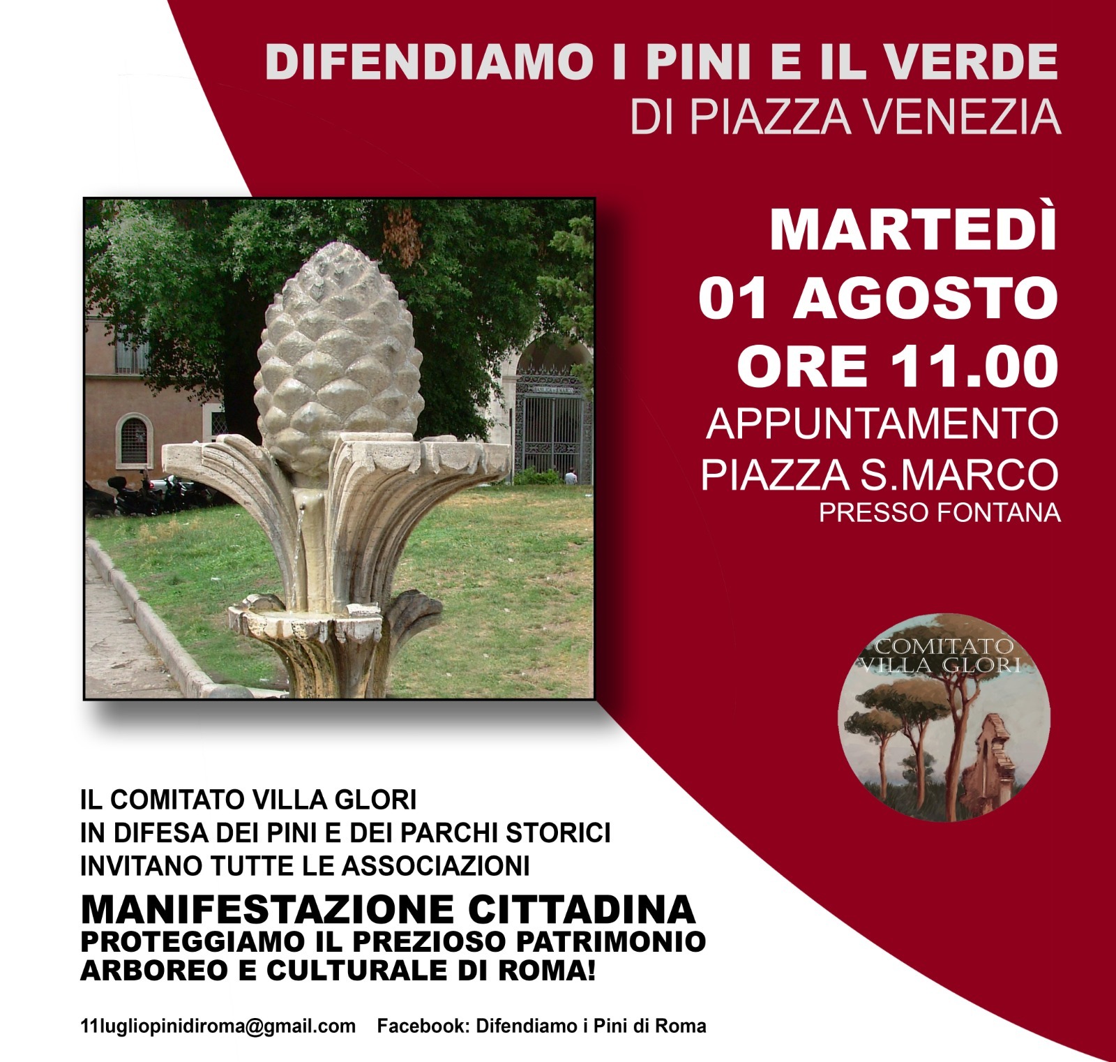 Martedì 1 agosto a partire dalle ore 11.00, cittadini e associazioni si ritroveranno a piazza San Marco, a ridosso della centralissima piazza Venezia, per protestare contro il recente abbattimento della sua piccola pineta e, in generale per le migliaia di alberature, soprattutto pini, persi in questi anni nella Capitale e sul litorale .