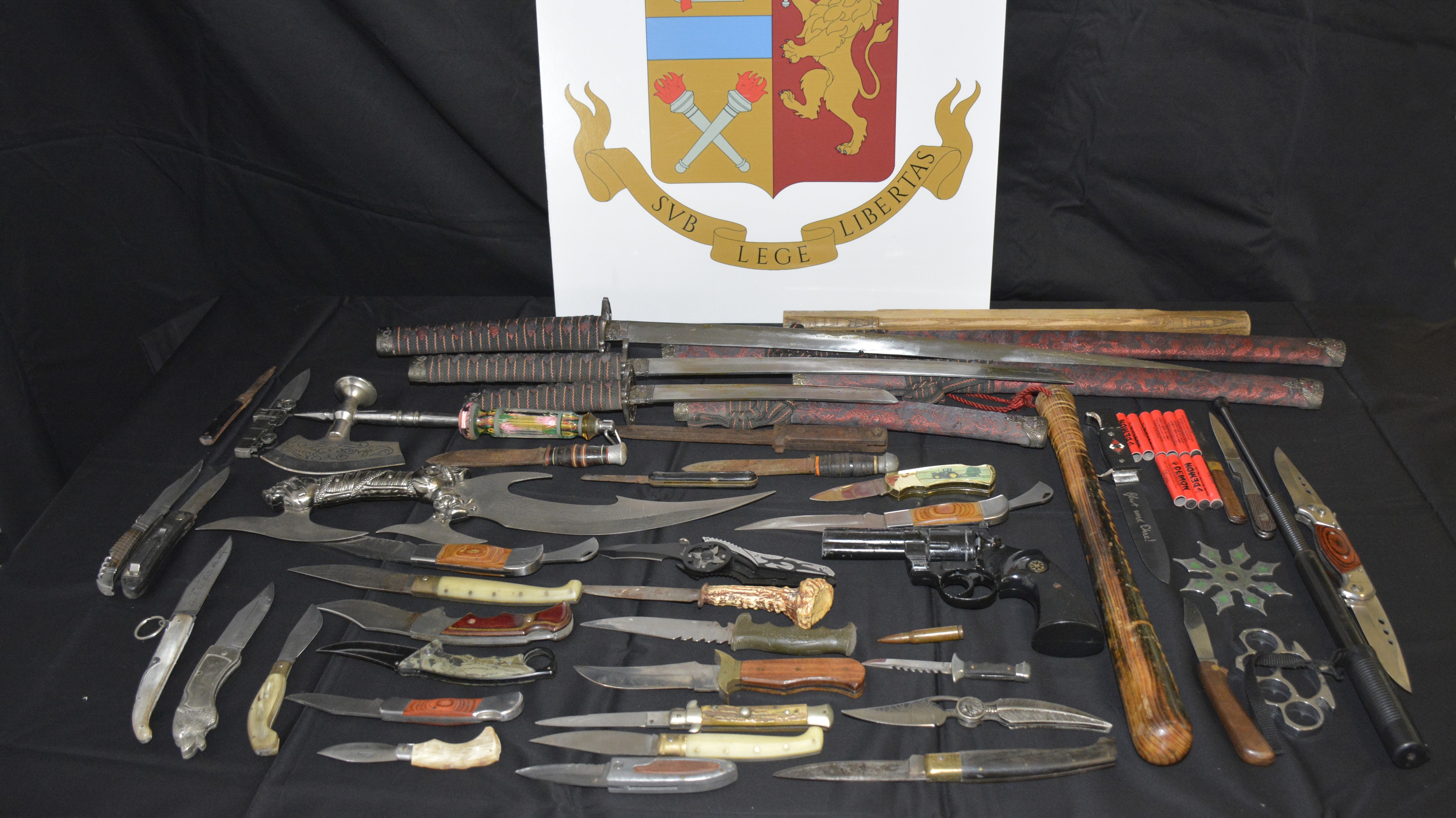 La perquisizione condotta portava al susseguente ed allarmante sequestro del seguente materiale: una cartuccia di armamento bellico, una riproduzione metallica di rivoltella privo di tappo rosso, decine di coltelli, sciabole, petardi, sfollagente e mazze di legno. In relazione a queste altre risultanze l’uomo veniva denunciato per porto di arma impropria, detenzione di munizionamento bellico e detenzione abusiva di arma comune da sparo.