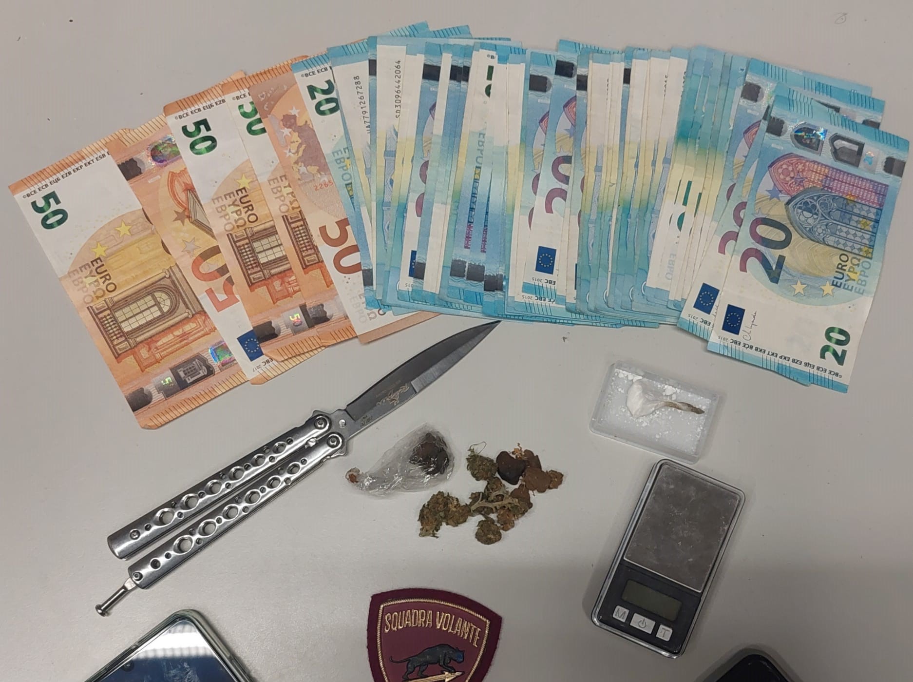 Gli stupefacenti sono stati trovati dalle Volanti durante una perquisizione dopo una segnalazione per disturbo al vicinato. Sequestrati 1.250 euro, un bilancino, cellulari e un coltello a farfalla.