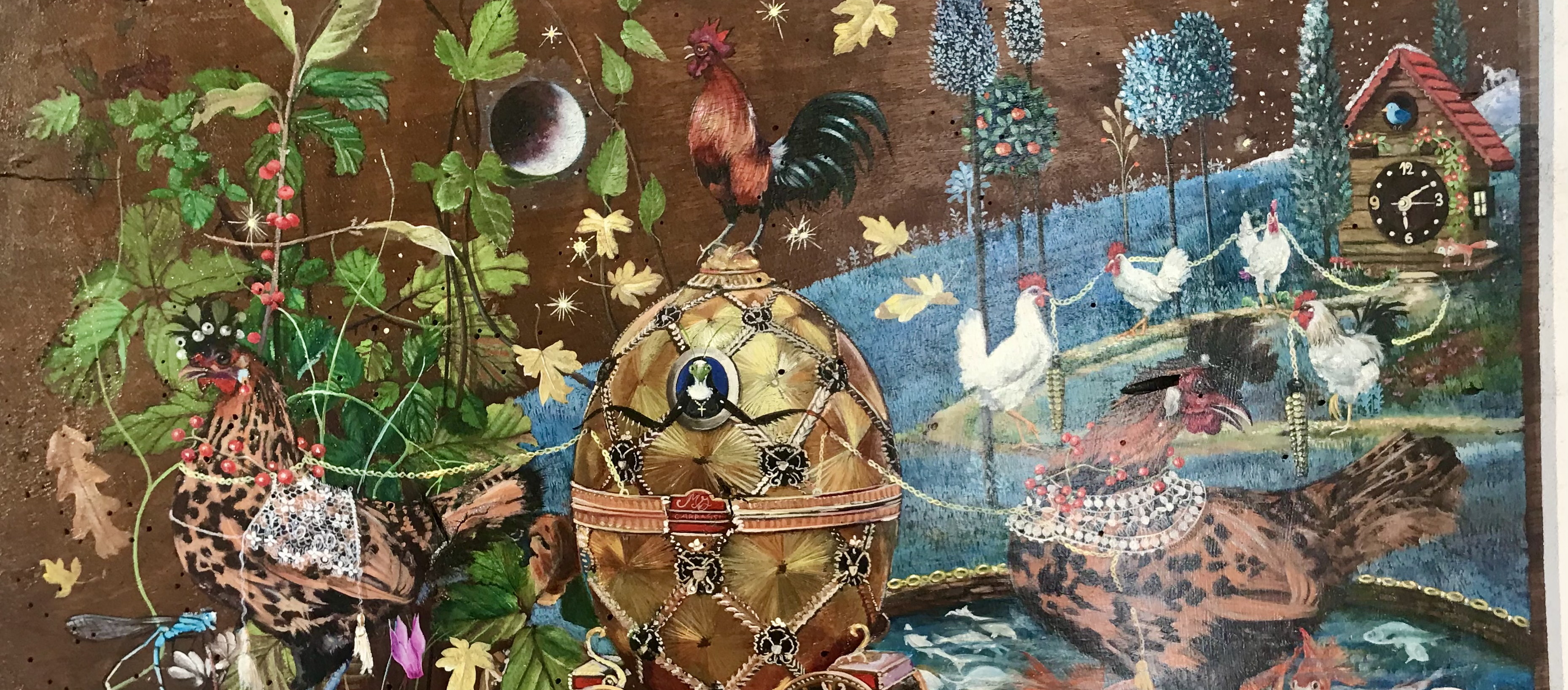 Le opere di Grazia Cucco, tutte realizzate rigorosamente su secolari tavole lignee, rappresentano un surrealismo mai artificioso, sempre spontaneo, popolato da insetti, fiori, frutti, suore e animali che si intrecciano alle trame della natura, rivelandone vizi e virtù come solo le sue straordinarie opere sanno evocare.