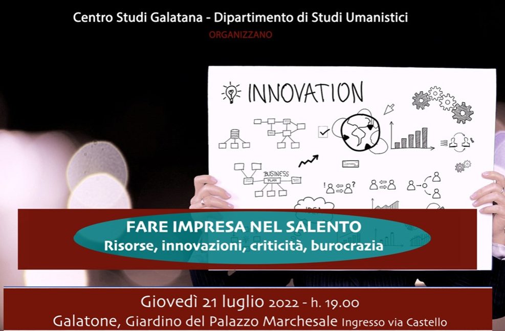 Su questo complesso di problemi, tra loro interconnessi, si terrà giovedì 21 luglio, alle 19, nel Giardino del Palazzo marchesale di Galatone, un convegno organizzato dal ‘’Centro studi Galatana’’ e dal Dipartimento Studi Umanistici dell’Università del Salento, con la partecipazione di amministratori, rappresentanti di organizzazioni economiche, imprenditoriali, sindacali, società di formazione e consulenza.