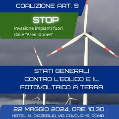 Coalizione art.9 della Costituzione, scende in campo a difesa del consumo del suolo e del paesaggio. A tal proposito ha convocato per mercoledì 22 maggio gli Stati Generali contro l’Eolico selvaggio e il fotovoltaico a terra a difesa del Belpaese. Coalizione art.9 è una coalizione formata dalle seguenti associazioni: Italia Nostra, Amici della Terra, Mountain Wilderness, Ente Nazionale Protezione Animali, ProNatura, AssoTuscania, Altura, L’Altritalia Ambiente, Crinali Bene Comune, Rete Resistenza dei Crinali, Associazione Italiana Wilderness AIW, Associazione Ranuccio Bianchi Bandinelli, LIPU Puglia e Basilicata, Centro Parchi Internazionale, Salviamo il Paesaggio, GRIG Gruppo Intervento Giuridico, Comitato per la Bellezza, Comitato per il Paesaggio, Emergenze Cultura. Interverranno sindaci, consiglieri comunali, consiglieri regionali, parlamentari e rappresentanti dei territori maggiormente colpiti dall'impatto delle rinnovabili: il foggiano che tanto ha già dato e che vede ancora tantissime nuove richieste; il Salento; la Sicilia con la provincia di Trapani in prima linea; la Sardegna aggredita da ogni parte da gigantesche pale eoliche e da campi sterminati di pannelli solari; la Campania con il beneventano; la Calabria con la provincia di Catanzaro e l’eolico off shore; il Molise, già coinvolto nei decenni passati, e ora minacciato da ulteriore sviluppo; nel centro Italia la Tuscia, la Maremma e, infine, l'Appennino tosco emiliano, in particolar modo il Montefeltro. Le associazioni e i comitati che aderiscono agli Stati Generali ritengono che la realizzazione sul territorio degli impianti di energia rinnovabile in assenza di qualsiasi pianificazione e le modalità attuali della transizione energetica stiano causando gravi danni alle comunità aggredite, alla loro economia, ai territori, al paesaggio e alla biodiversità. Pertanto, chiedono: 1) che i pannelli fotovoltaici debbano essere installati solo sulle superfici edificate, sulle aree degradate o nelle aree di bonifica, al di fuori dei centri storici; 2) che debba essere cancellata ogni forma di incentivo e bandita ogni forma di speculazione a spese delle comunità locali; 3) che gli impianti energetici da fonti rinnovabili possano essere insediati solo ed esclusivamente nelle Aree Idonee definite dalle Regioni, in base a linee guida, senza produrre ulteriore consumo di suolo; 4) che nelle more dell’individuazione delle aree idonee si sospendano nuovi insediamenti; 5) che vengano abrogate le norme che consentono gli espropri di terreni agricoli per la realizzazione di progetti di rinnovabili. Per partecipare è possibile registrarsi al seguente link https://forms.gle/D1ogRc7kre2RzV6f8, prendendo visione degli obiettivi elaborati in un Manifesto programmatico.