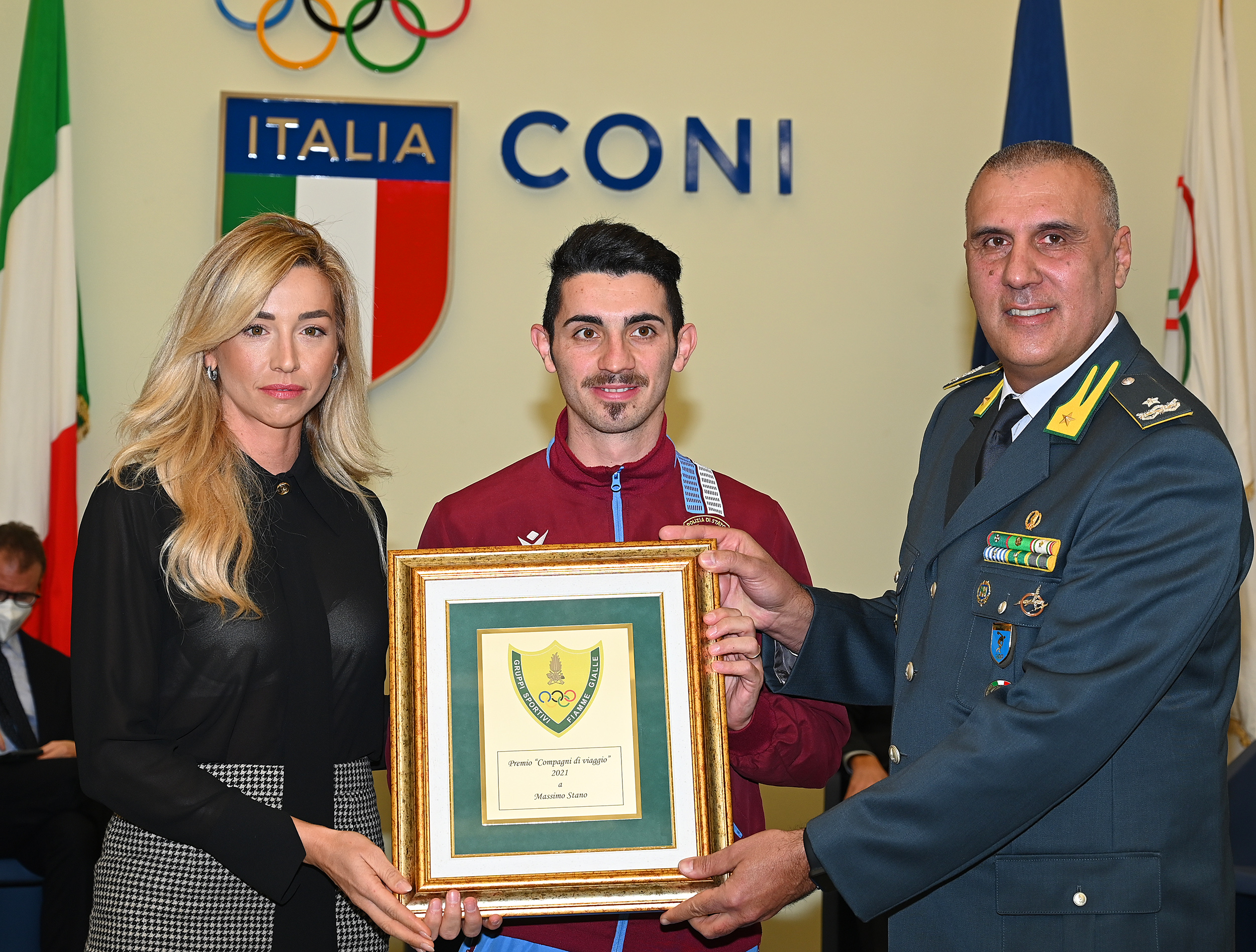 - “Compagni di viaggio” a Luna Rossa Prada Pirelli Team, per la splendida vittoria nella Prada Cup ottenuta con a bordo tre ex velisti Fiamme Gialle e Romano Battisti, al Centro Diurni Disabili “San Martino”, per aver contribuito all’abbellimento della caserma del III Nucleo Atleti a Sabaudia con i propri manufatti, ed infine a Massimo Stano (Fiamme Oro), medaglia d’oro nella 20km di marcia alle Olimpiadi di Tokyo, sotto la guida del tecnico gialloverde Patrizio Parcesepe;